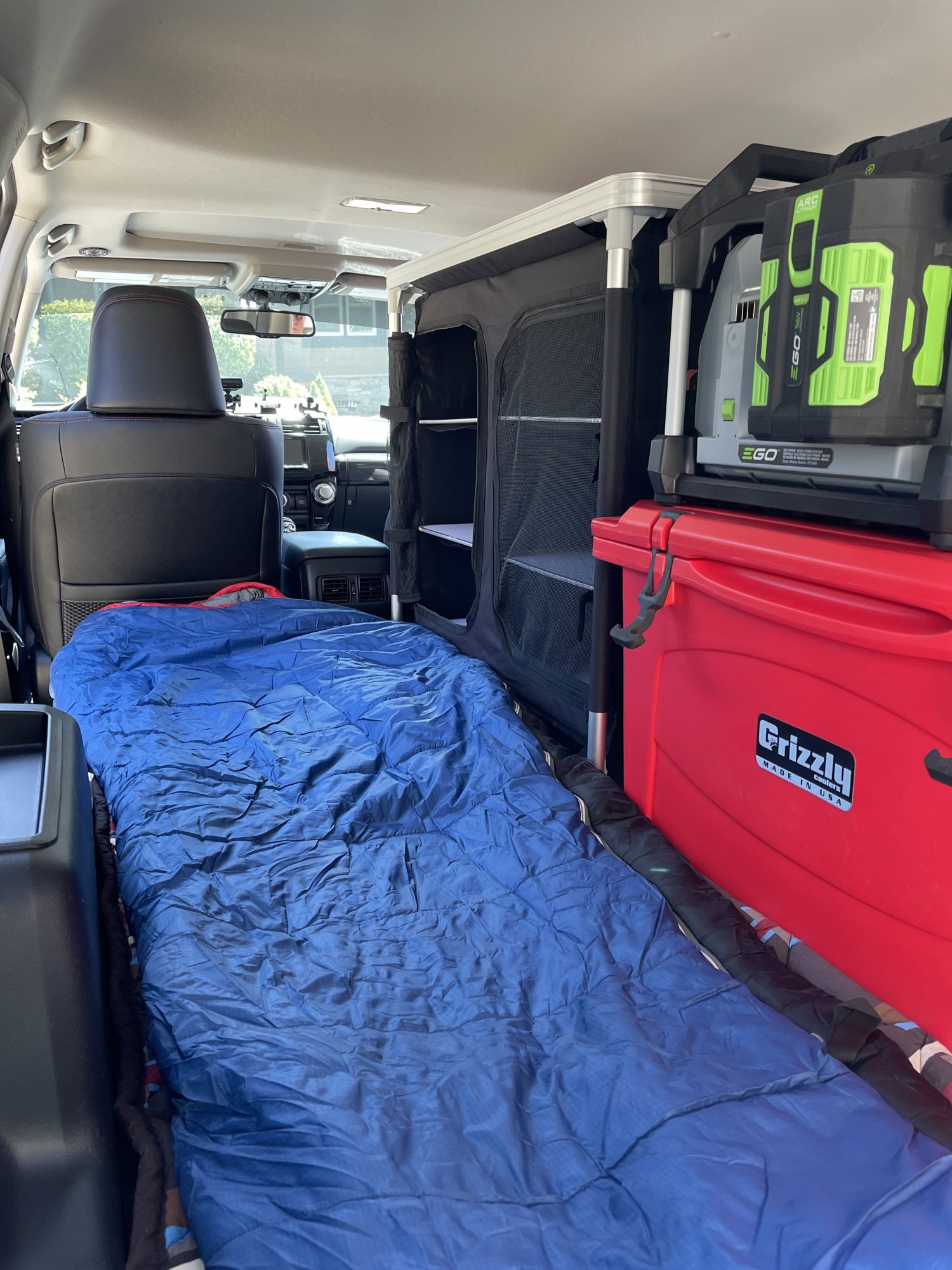 Very good! Congratulations on the organization! It's very cool!Heading out for 4 days of overland vehicle camping in the mountains. Removed the back seats and built a platform.