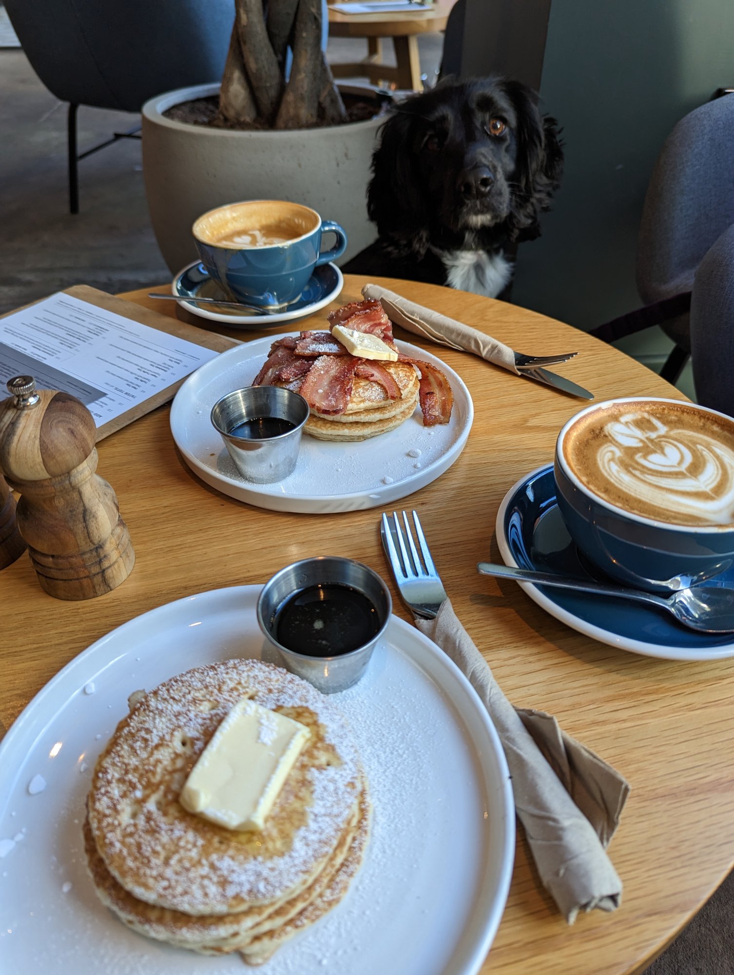 She got some 🥰😋That doggo wants some bacon and pancakes.