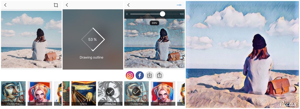 Just like the picture: Open Picas, choose a picture or take a picture, choose a style, and the picture is under processing, after finishing it, adjust the intensity of the filter and save. Congratulations! You just create your own artwork within 10s.