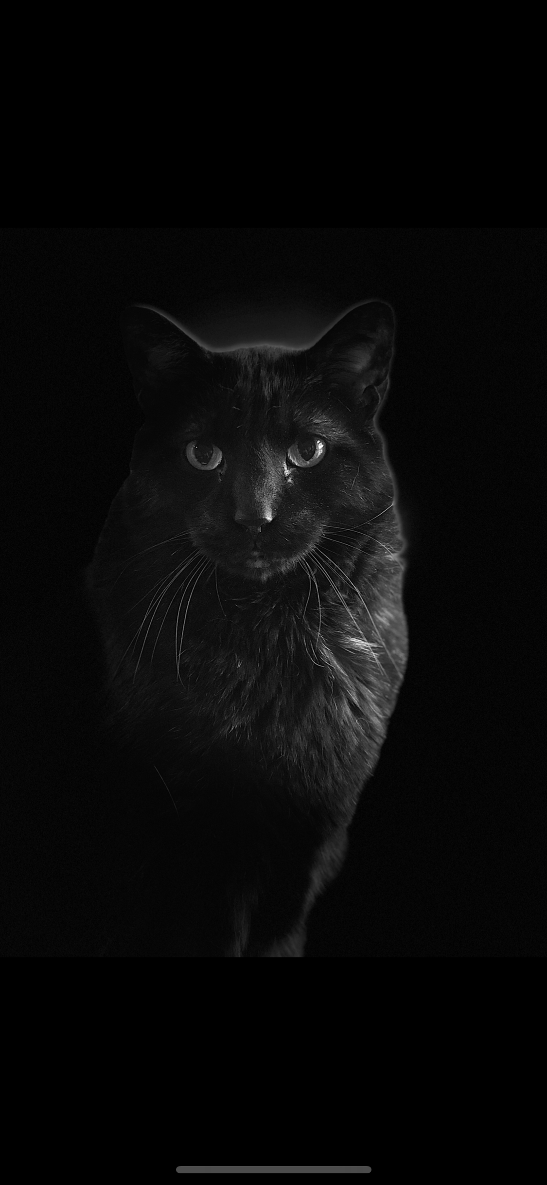 Thanks!! Can you believe he was just sitting on the table in front of me? I used portrait mode, then I edited it afterwards just in the photo app switching it to stage light mono and was pretty impressed lol!Dramatic ! Very nice. Love the cat. Made it my wallpaper on my iPad Pro.