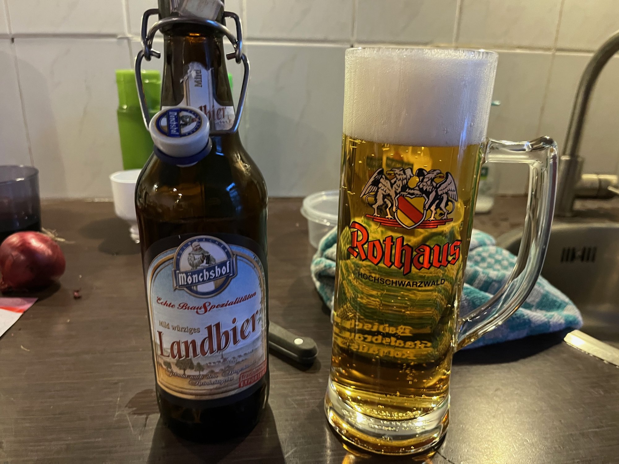 Two of my favourite German brewers, Mönchhof Landbier (although their regular pils is even better) in a Rothaus glass. I went to the Rothaus brewery last summer and their giftshop was awesome, but the smell of the brewery was even better!