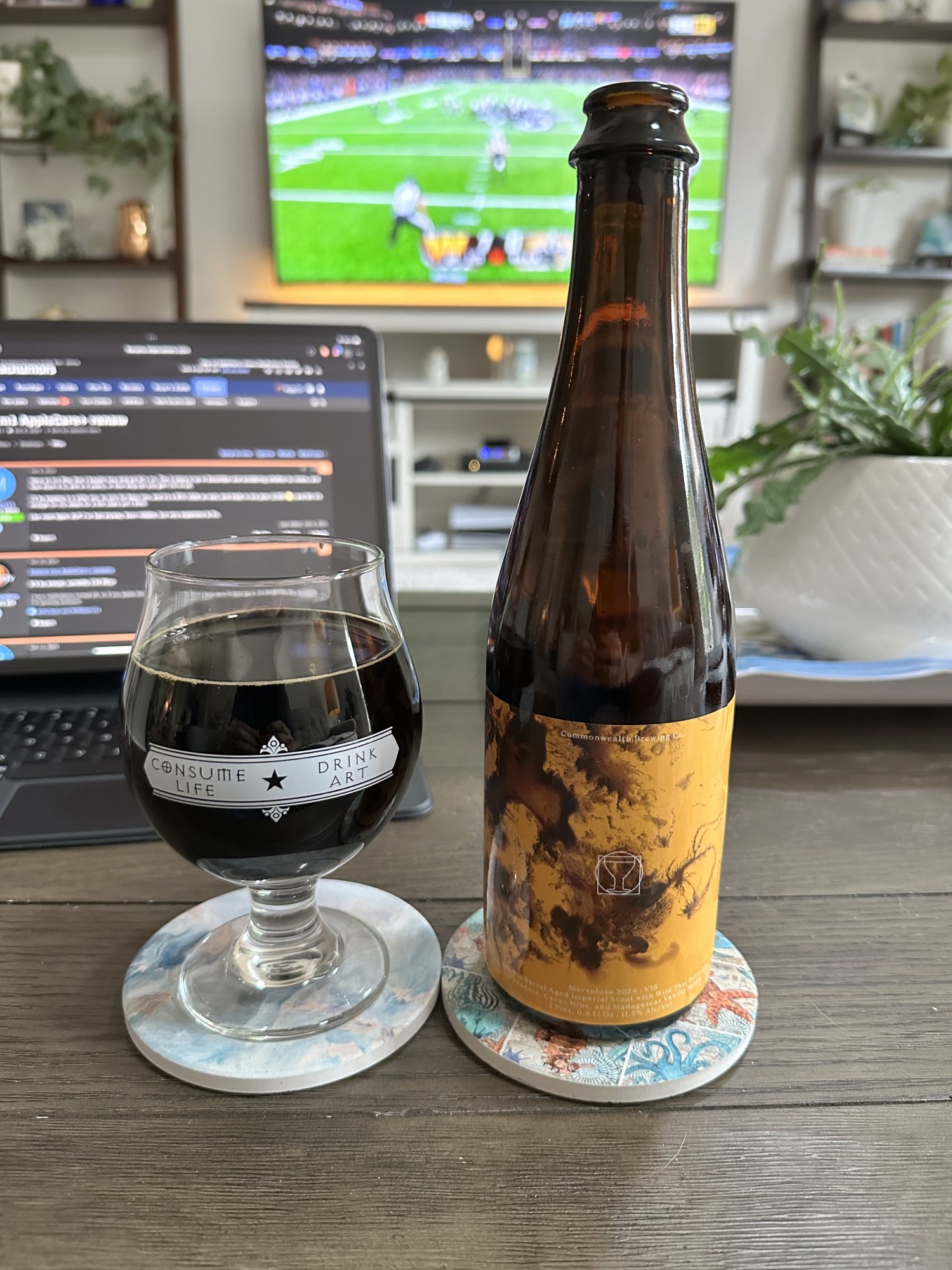 With some of the rather robust beers (in other words, with some of the beers that are exceptionally strong and highly alcoholic), - in general, some of those beers that are in excess of 11% abv - my experience is that the strength of the alcohol can unbalance the beer, and have the effect of smothering some of the other - more subtle - flavours.Commonwealth Marvoloso V15, double barrel aged inperial stout with wild thai banana, peanuts, cacao nibs, and madagascar vanilla beans. 11.5% ABV. I get a lot of vanilla and cacao, but not much else. Overall a pleasant beverage, but would have liked a hit of banana