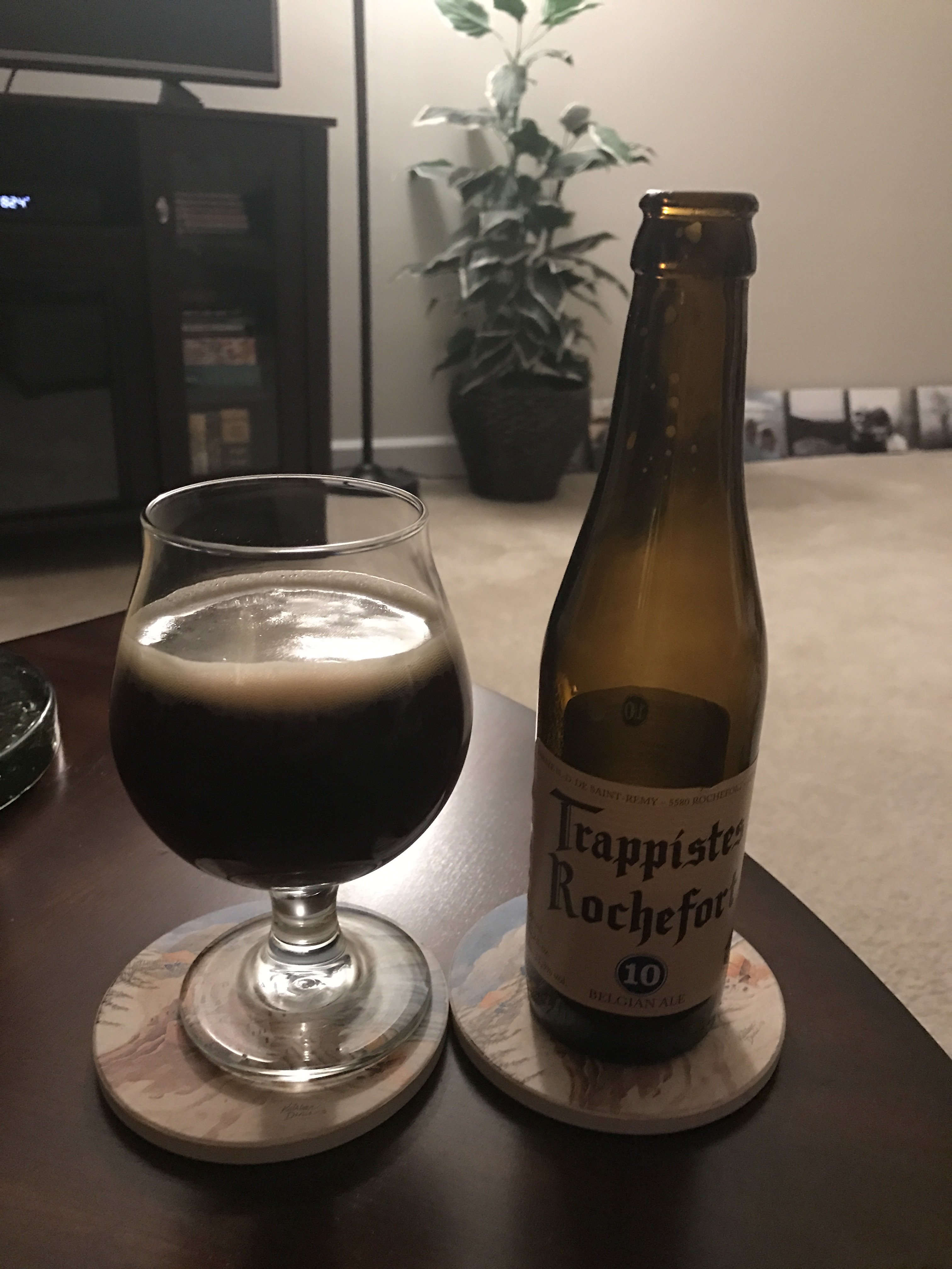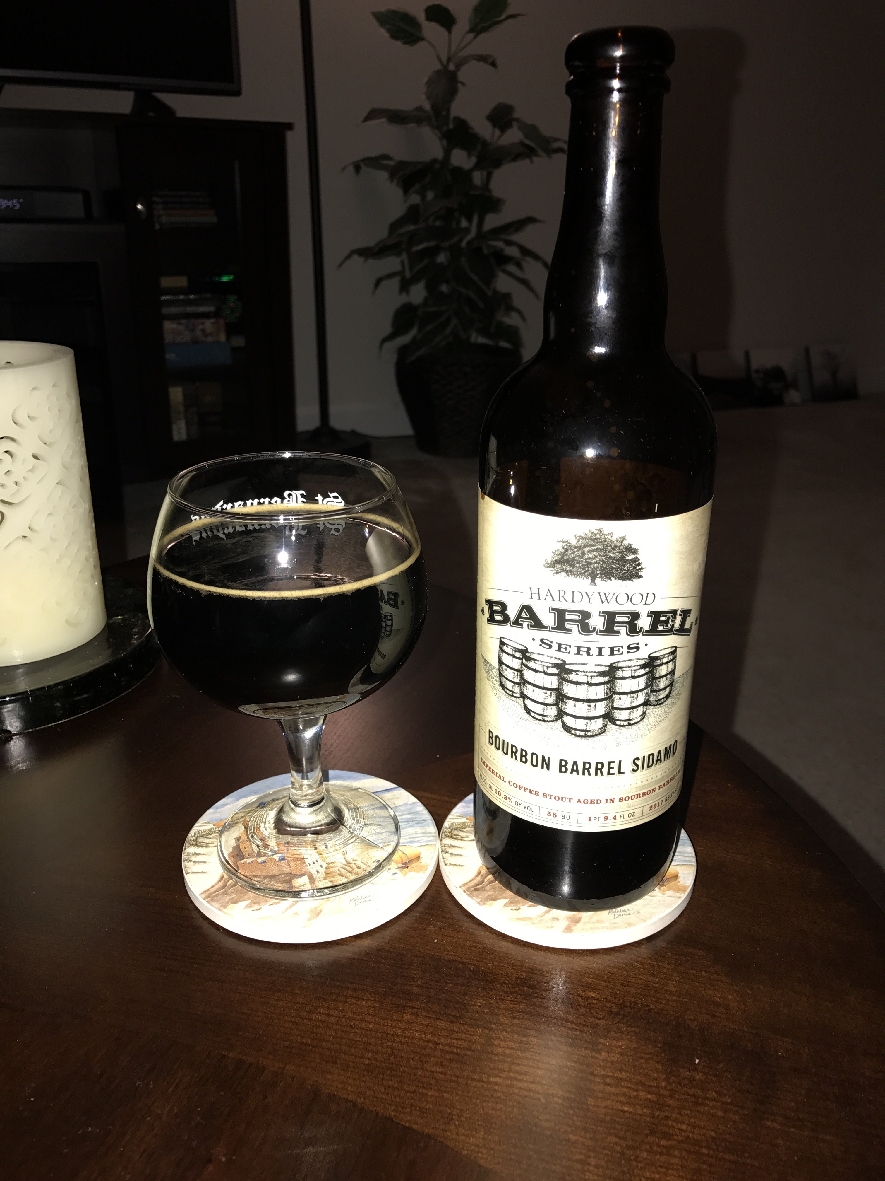Its Hardywood Bourbon Barrel Sidamo. Its a coffee stout that they age in bourbon barrels. This one is at 10.5% ABV. I'm not good for describing all the flavors. I taste coffee, for sure, like a dark roast, and then after that first sip, you can feel the bourbon kind of heat up your chest. My wife is not a dark beer lover by any means, but even she found this one to be amazing (she drinks dark roast coffee). The aroma, coffee for sure, but there's hints of other things as well - definitely enjoyable. I went back and bought 4 more bottles