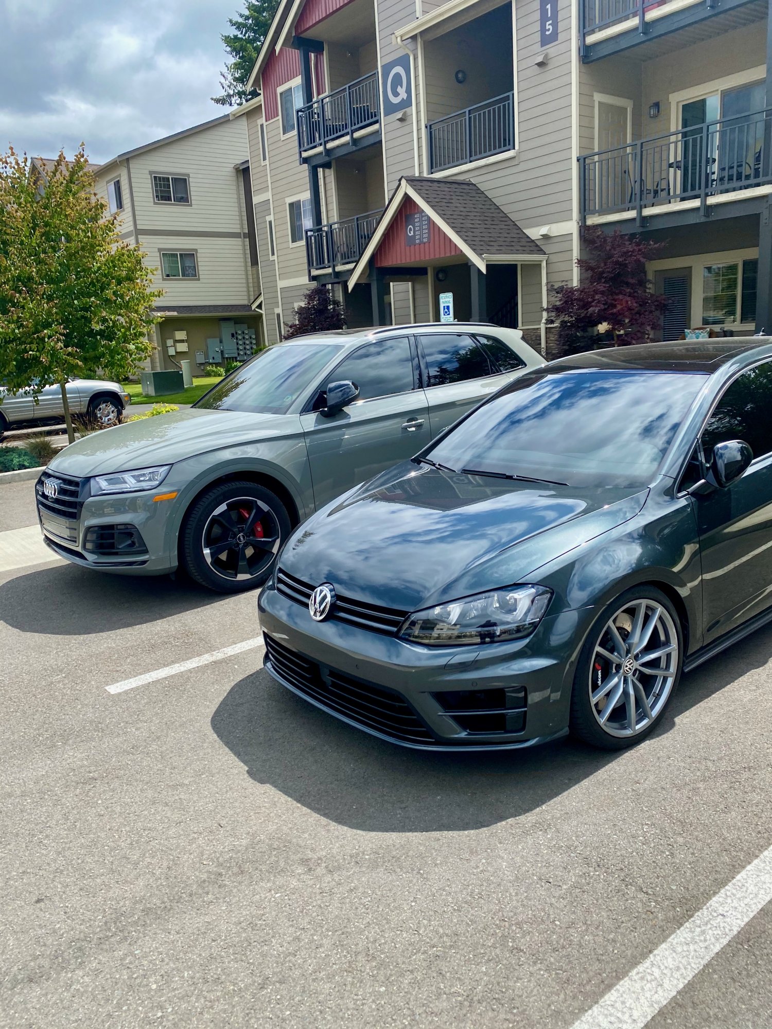 Similar setup to yours except SQ5 and GTI. Love the black optics on the Q3.Ordered a 2021 Q3 in September last year and it arrived in mid January. I went with S Line Premium Plus with technology, black optics, and parking assist packages added. I also ordered it to come in with the blacked out badges and all weather mats. Bonus: The old Golf R I rarely touch anymore.