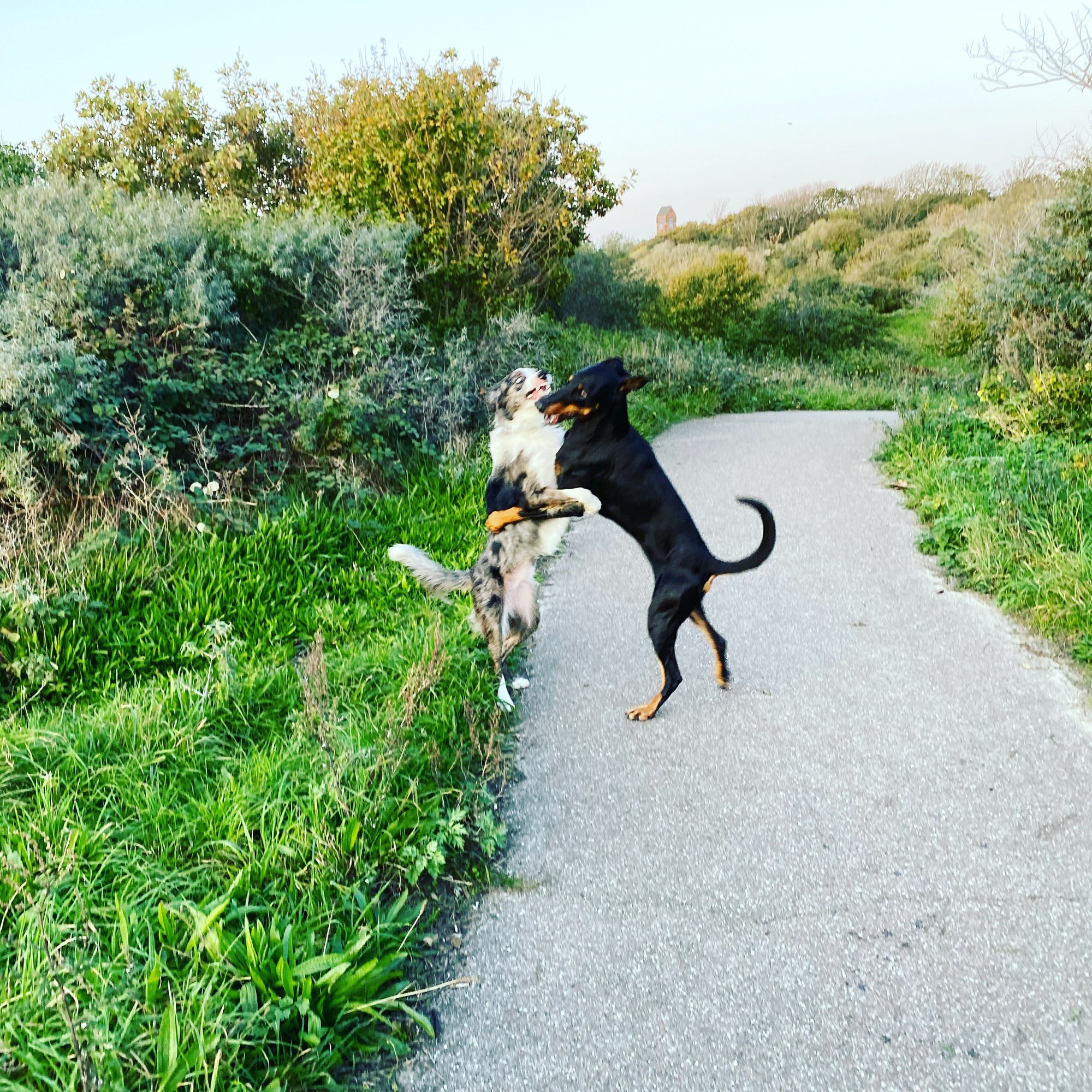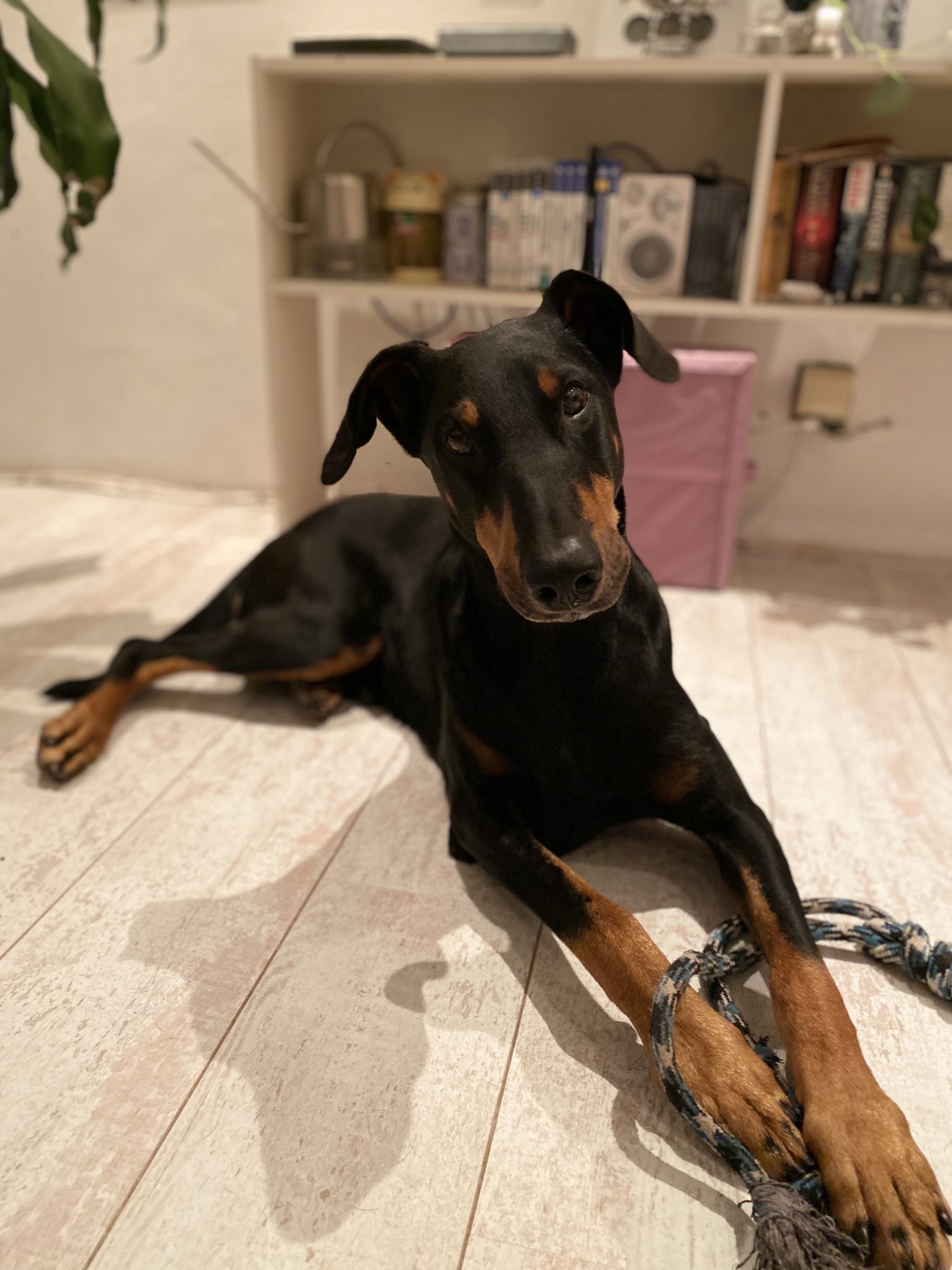 Yep, here he is in kind of a blurry picture (hand was not steady) but I still like it:Cute doggo...is that a doberman?