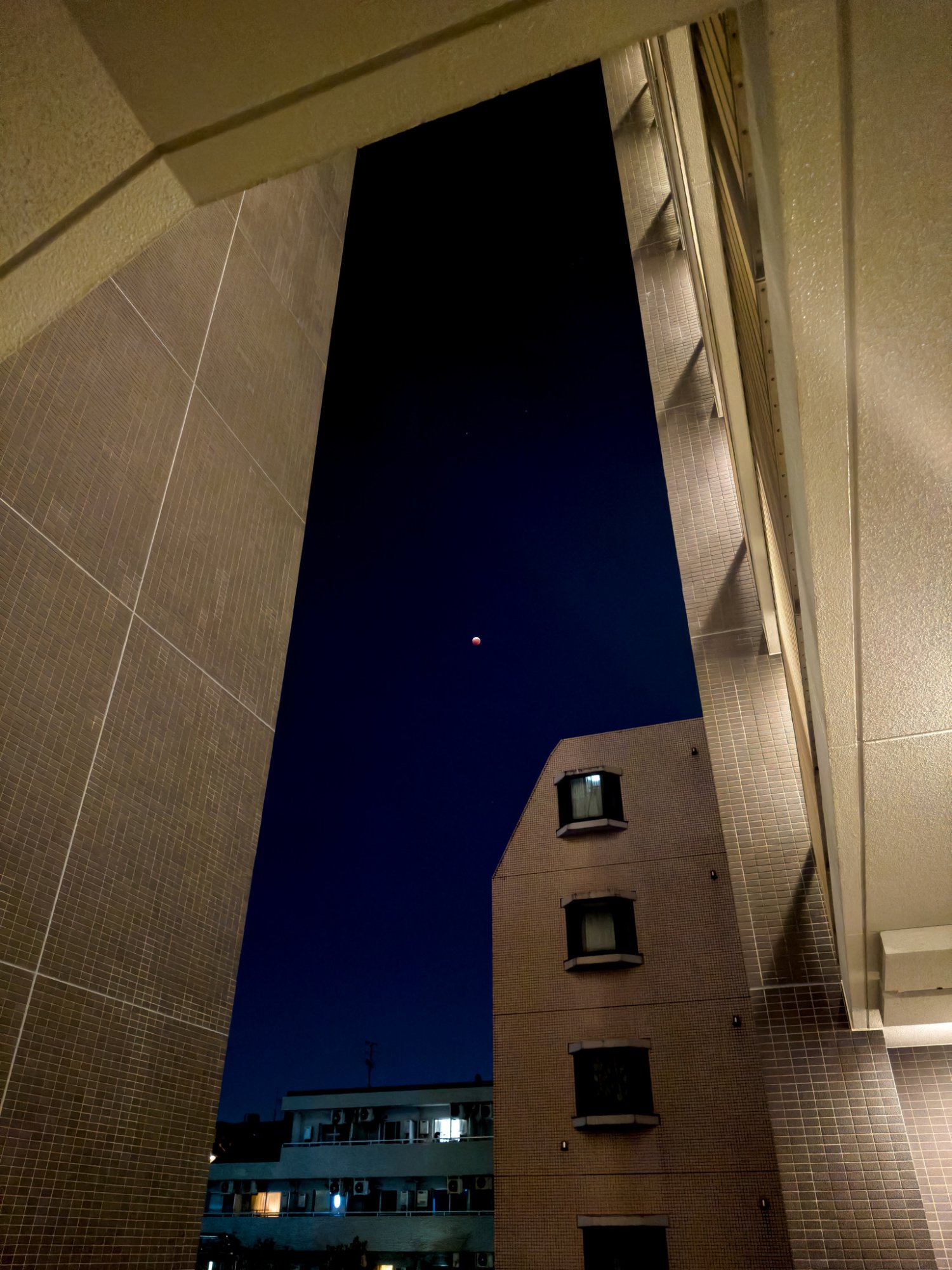 I bet living in tokyo you have amazing opportunities for street photography in the evening.So I tried to take pictures of the lunar eclipse last night, but as I live in Tokyo it's a bit challenging. I got two decent pics: