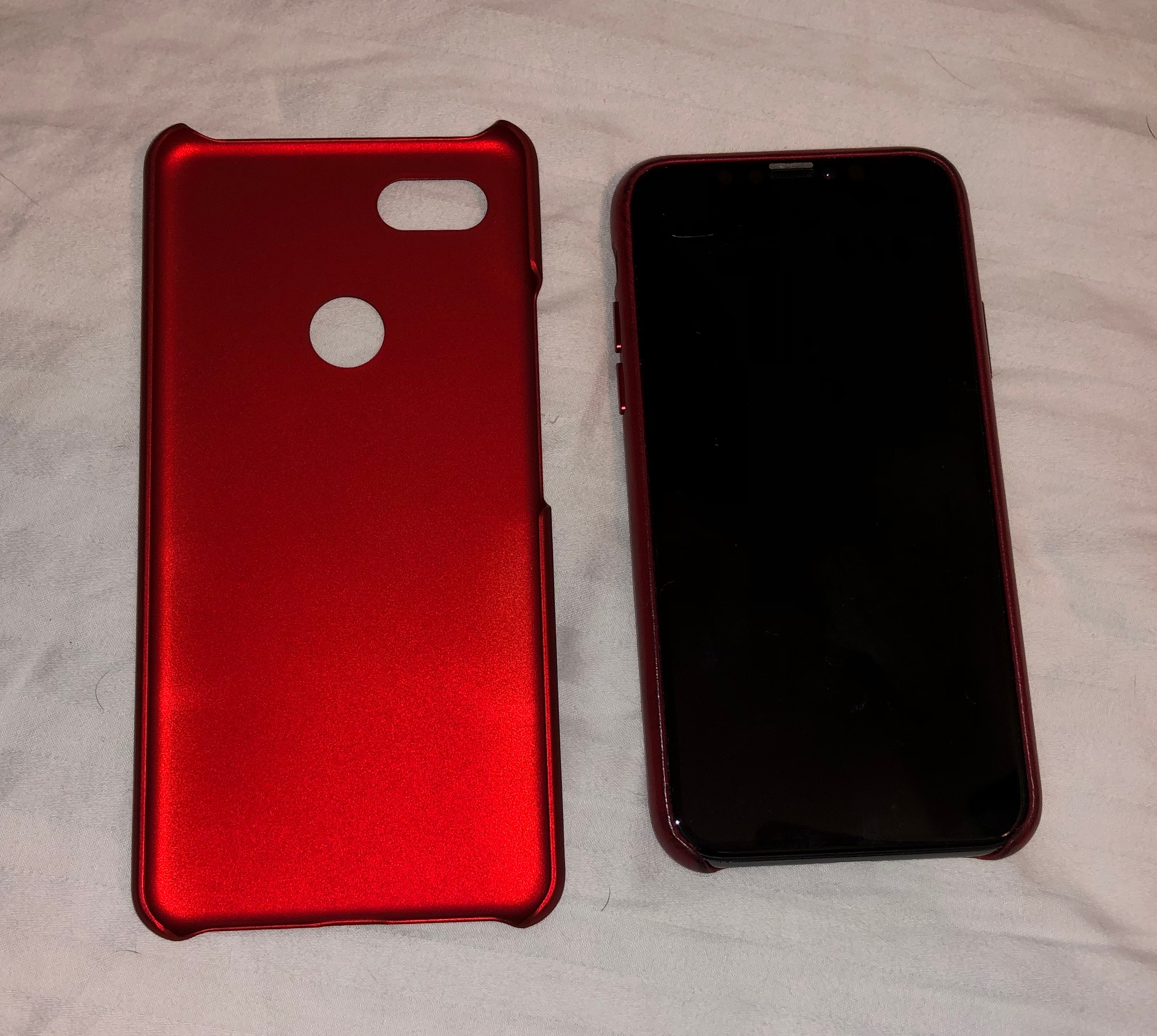 Here it is. The satin red version of that case and comparing it to my iPhone X in size. The case has a nice feel to it, though a bit slippery because of that satin feel. Still, it's very thin, just like I wanted.I bit the bullet, and just pre ordered a white Pixel 3 XL, I didn't realize I had a $100 store credit with Google, so the 64GB came in at $855. Will give my Wife my Pixel 2 XL.
