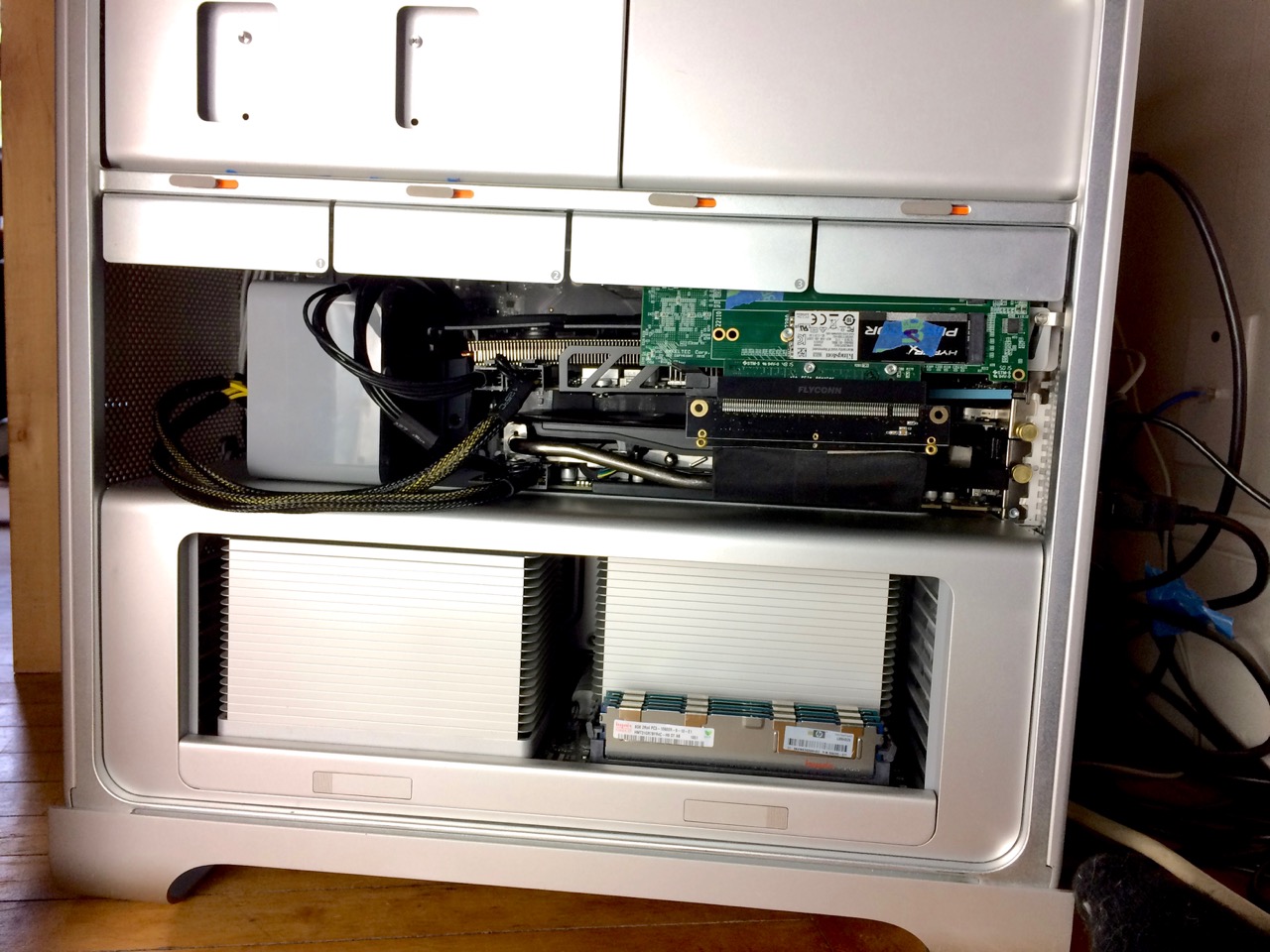 Instead, I might try moving my two backup HDDs (for CCC and Time Machine) to drive bays 1 and 2, and make a little harness to hang the Amfeltec card in the unoccupied space of bays 3 and 4.