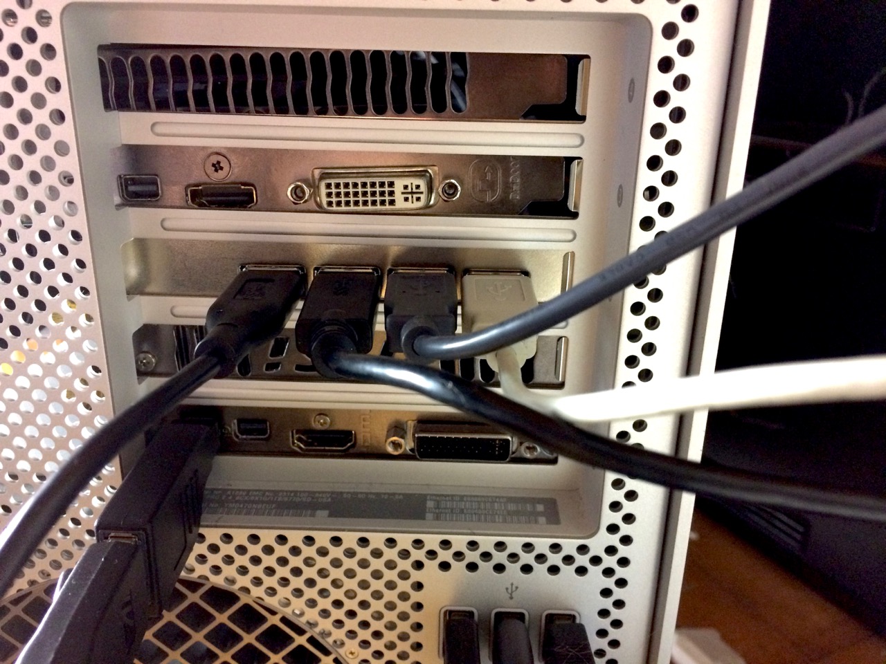 One problem with putting the 2nd GPU on a riser card is that it is heavy and doesn't get enough support, so it tends to sag downward. The Mac Pro's card bracket can't hold it in place, in fact I couldn't get the bracket/bar thing to fit at all in this config, so I used some short knurled thumbscrews to lock in the other cards. Also, at least one of the ports on the 2nd GPU is obstructed, and in fact you could easily unseat the card while plugging/unplugging since it is only secured by friction. I don't plan to use any ports on the 2nd GPU, so I will put tape over them. Here's what the rear panel looks like: