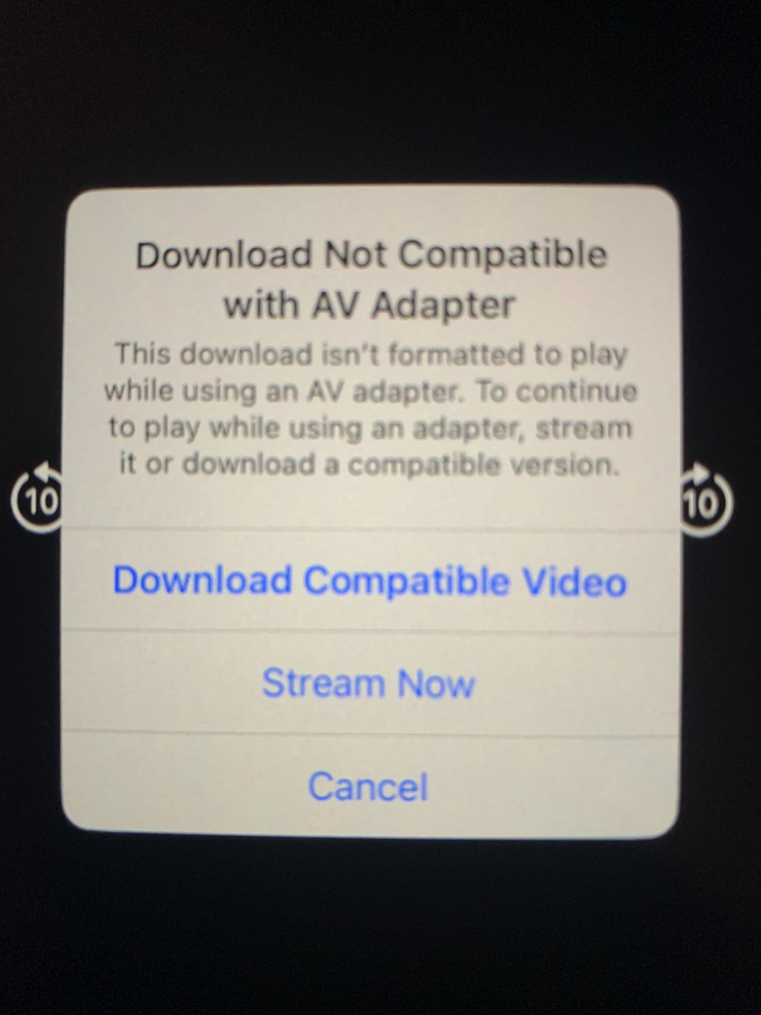 When I plugged in to the TV it said the download wasn’t suitable for playing via that cable connection and offered to either stream or download the appropriate version. I have no data/WiFi to do so.