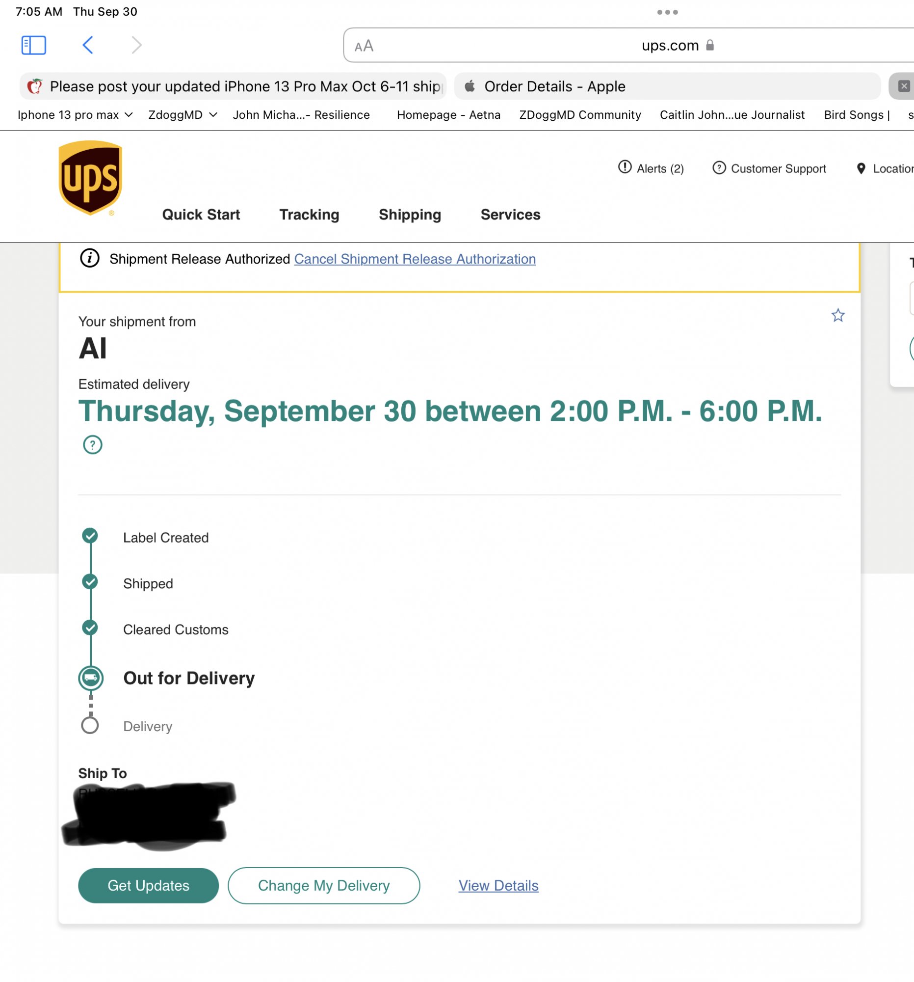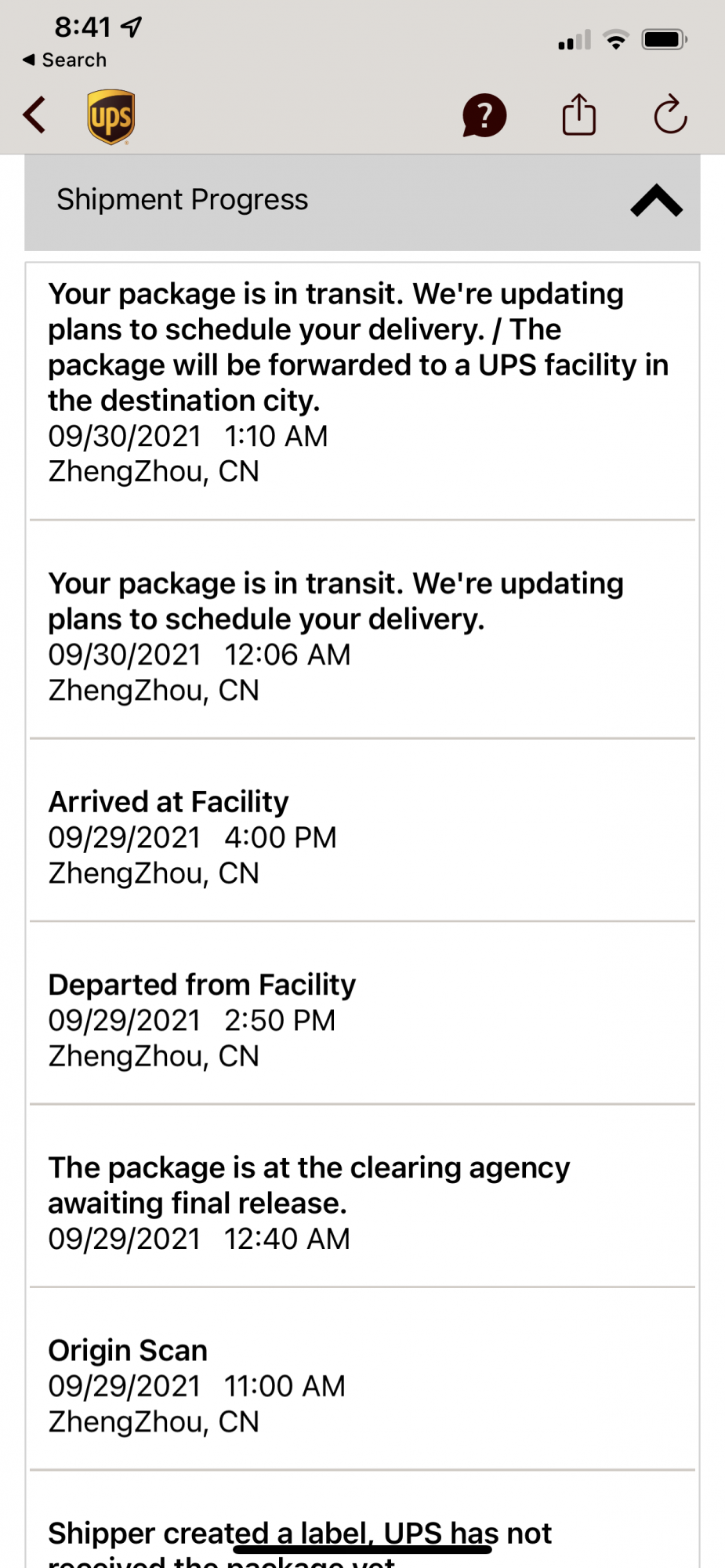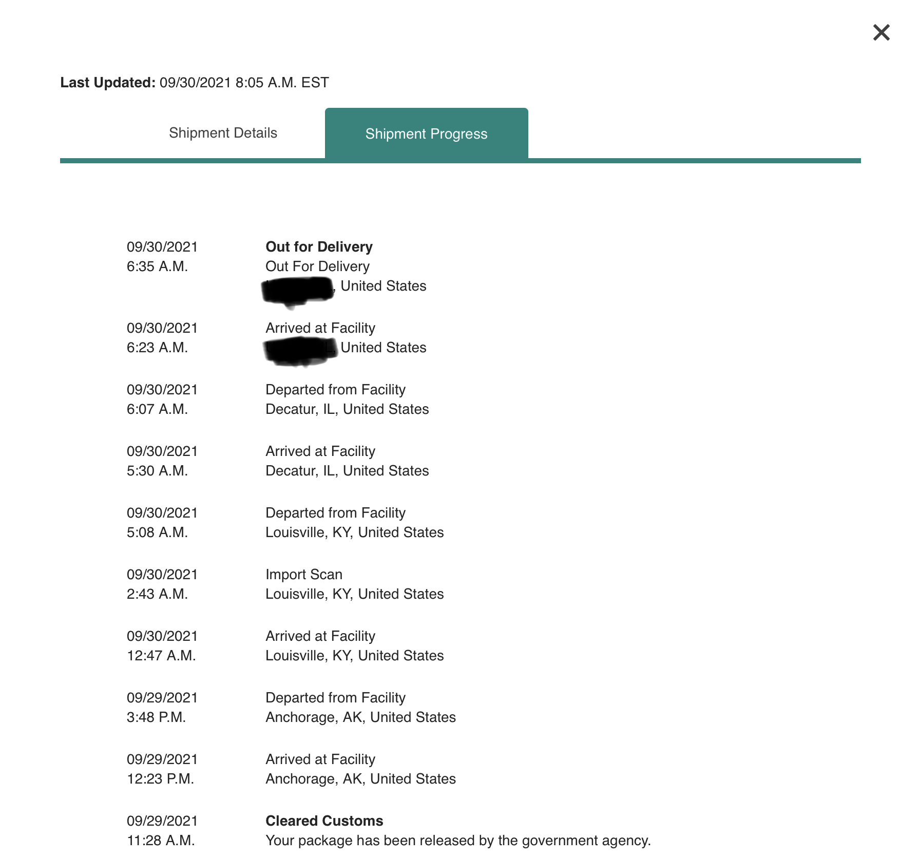 Well very interesting tracking from Louisville early this morning. It left around 4 AM EDT and got to Decatur Illinois in hour and half? They must have flown it because its 3.5 hours by truck to house (often route my phones take from Louisville) and 4 plus hours to Decatur. It was 1.5 hours from Louisville to Decatur in this tracking so flying appears to be only option. Usually it takes 45 minutes from Decatur to here on interstate at 70 plus (its 58 miles) but it got there at 5:30 and supposedly left a bit past 6 (at least scan of departure was half hour after) but I bet it left faster. It’s here and although normally on truck for delivery and it sits til 9Am it says out for delivery half hour after it got to UPS main hub here in town. Interesting not sure what went on LOL. Even Apple says arrives today and often thats not til on truck for delivery. One other odd note is that never saw customs release in Louisville so the Cleared Customs scan after leaving Korea was not a repeat of Chinese Customs clearance but it was clearance by US Customs and my package then sped through Louisville and then sped here something positive going on not sure what though LOL. Hopefully others will soon have progress and earlier dates in this spread of original 10/6 to 10/11 folks.