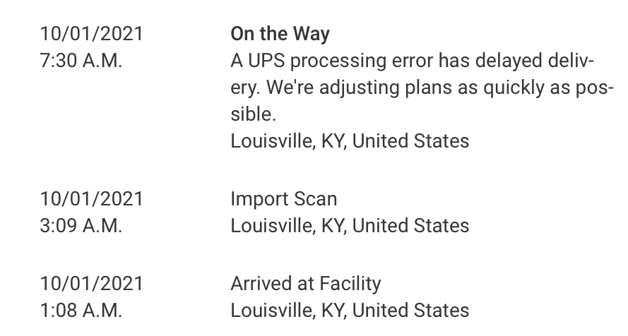 Can you get in touch with ups and see if you can pick it up at their hub?Mine needed to get out of Louisville for Oakland by 4am or so to get it today. Looks like a very likely Monday Oct 4 for me for my original Oct 6-11 ETA.
