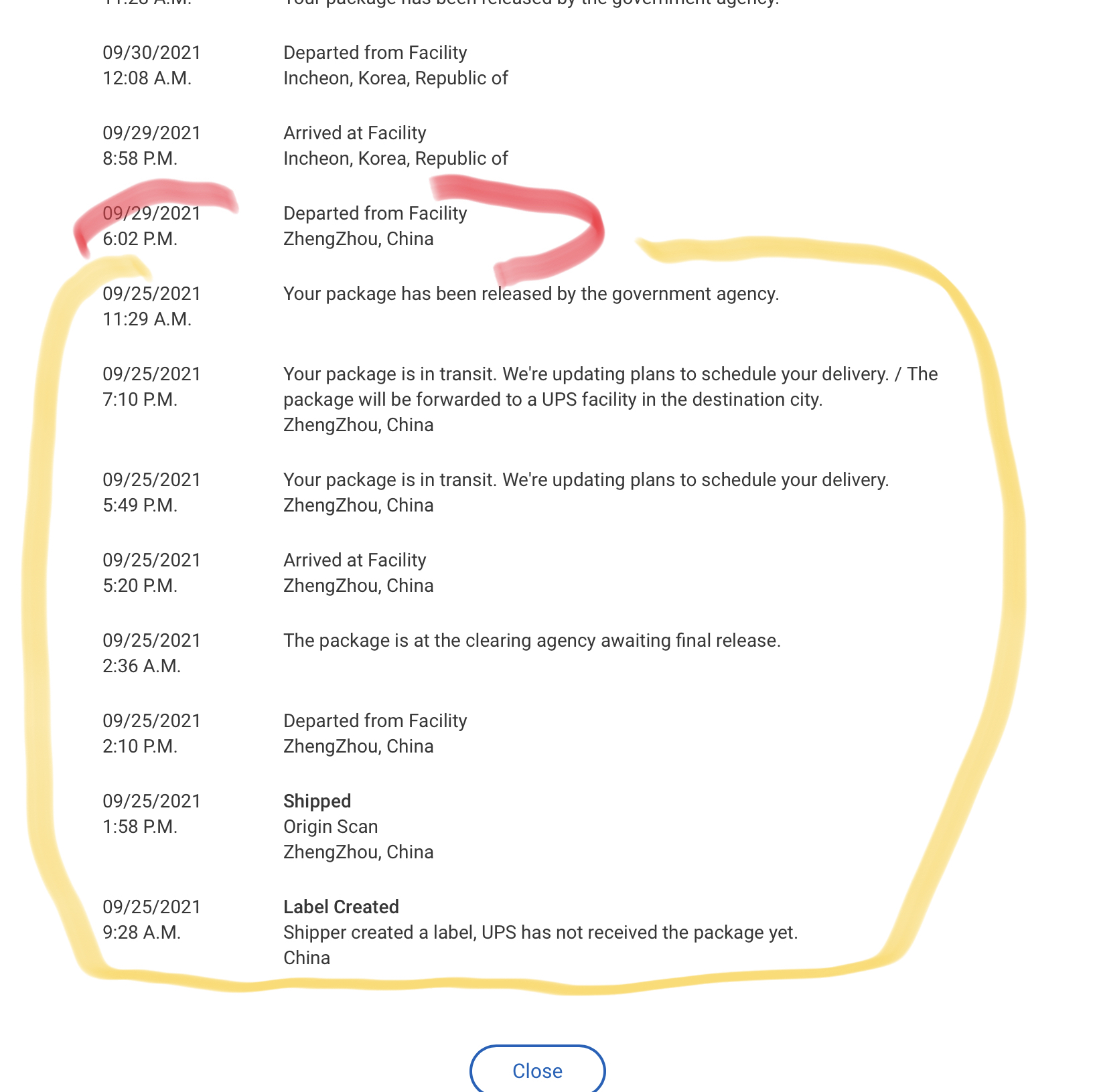 Did your delivery date change several times? UPS is still saying it will be here tomorrow. But according to tracking it’s in China stillRather than answer several this again is what I experienced with my phone that made it to me on 9/30. Like many of you my phone sat after all the clearances and such The yellow mapped on screen dump. It then sat for me for 4 days until the pallets were finally loaded on a plane and left (the red). Til you see this departure (red) all the rest means is that your phones are in pallets at the airport waiting to get one of the currently limited planes out of china (likely due to the shortage of shipping containers and delays of said containers in ships so folks are getting planes competing with UPS for planes out of China. So hence the check back and differences on UPS which until it really ships out of the airport all the dates are estimates by computer based on what it would take at that moment if they ship. Apple stays conservative in date until that phone actually is in air on way to Louisville. (About 24 hours to complete the China to Louisville leg. Anyway here again is my portion of scans with those items for your reference: