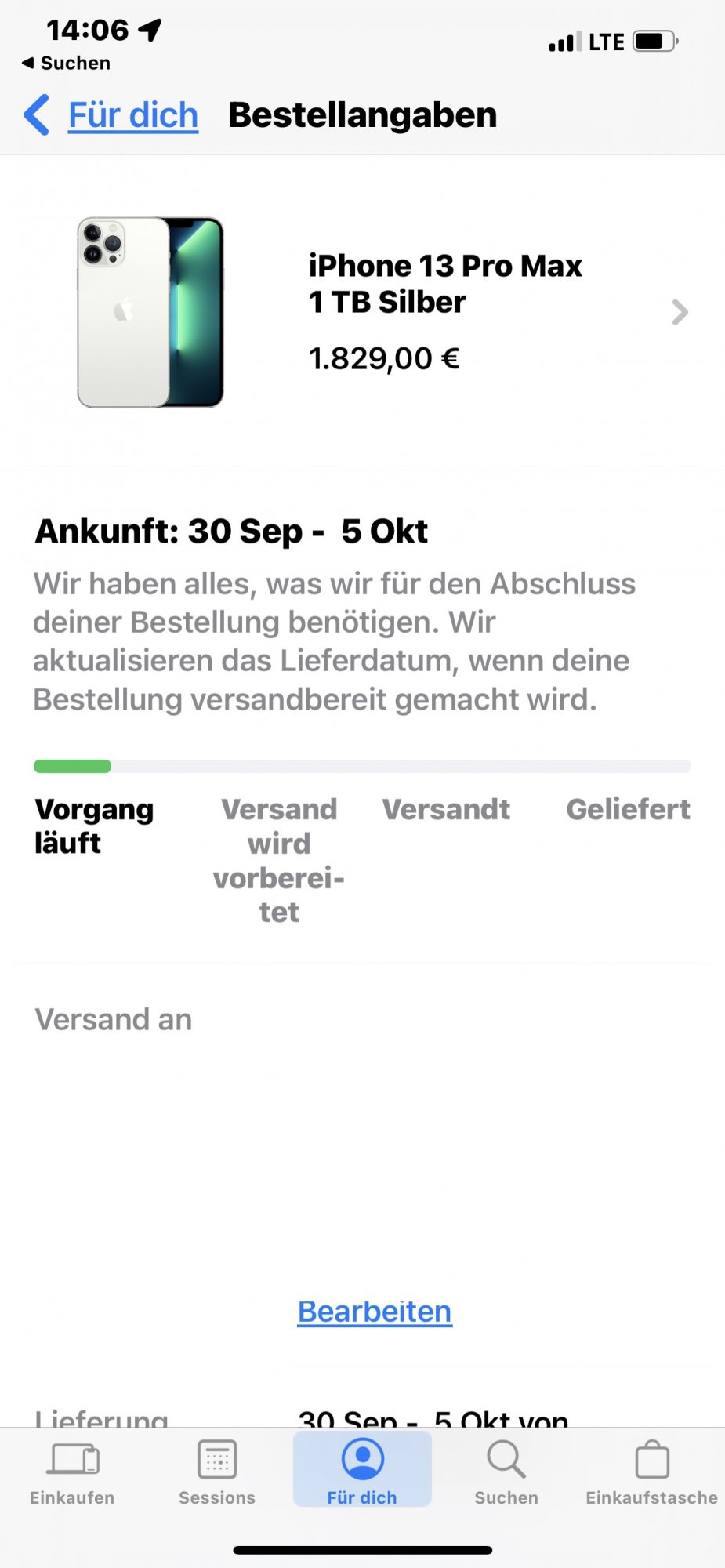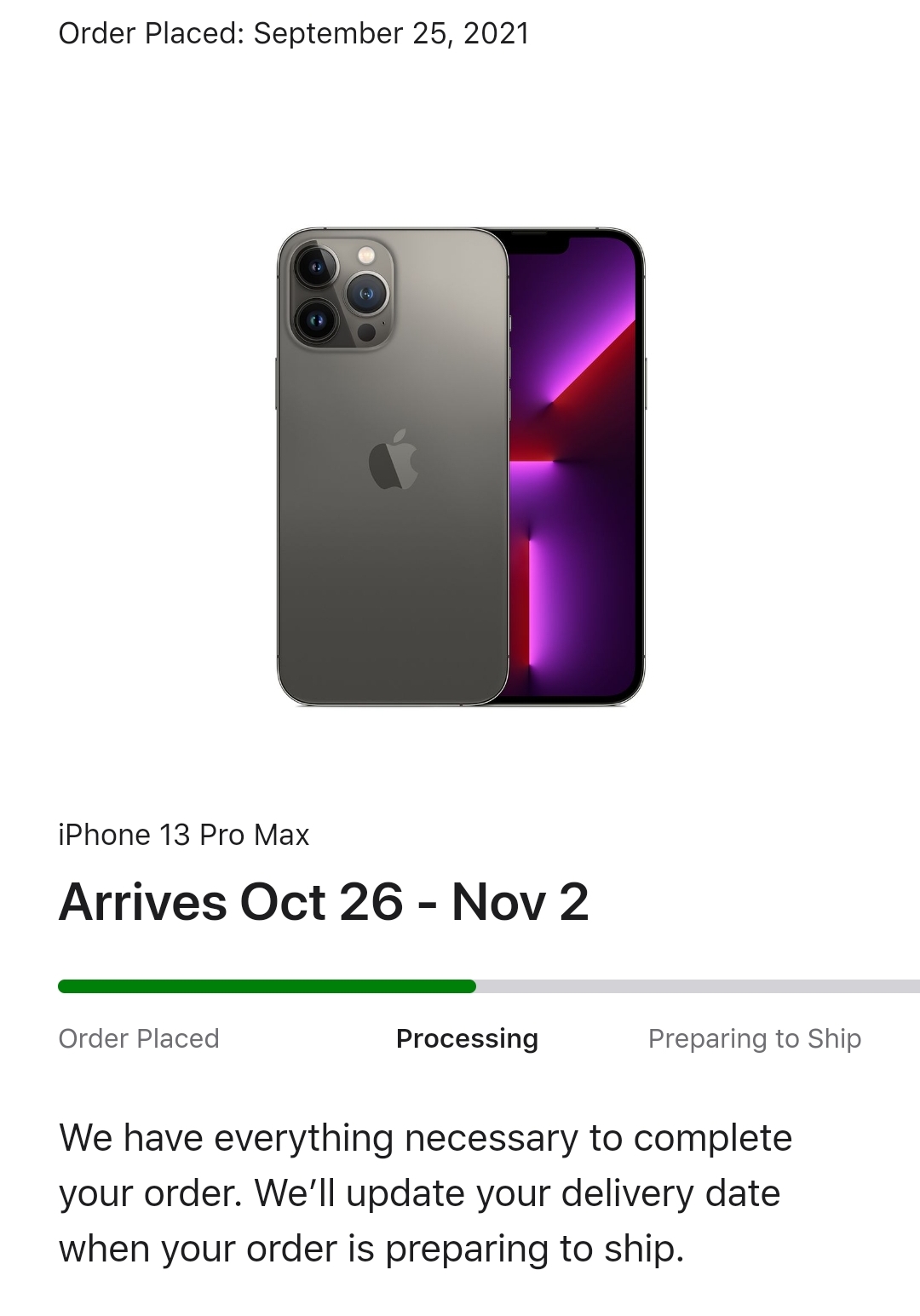 Mine did within the last 24 hours (Friday night/Saturday morning). Was originally a 9.24 delivery, and then delayed to 10.4-6. (Silver Max 1 TB).Anyone who ordered the 1TB iPhone 12 Pro Max with Oct 6-11 estimate seeing their order PFS?
