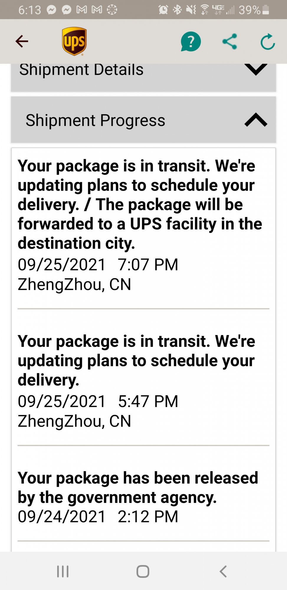 7:10 P.M. Your package is in transit. We're updating plans to schedule your delivery. / The package will be forwarded to a UPS facility in the destination city.