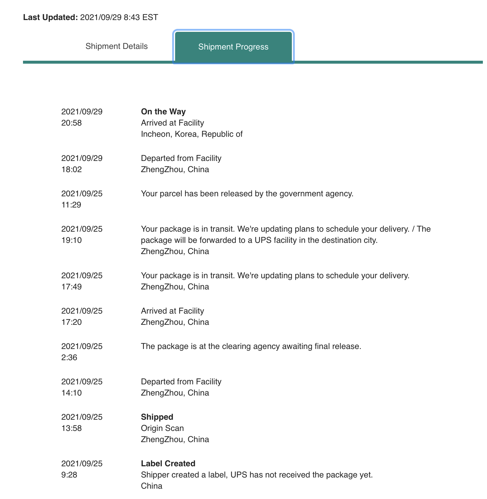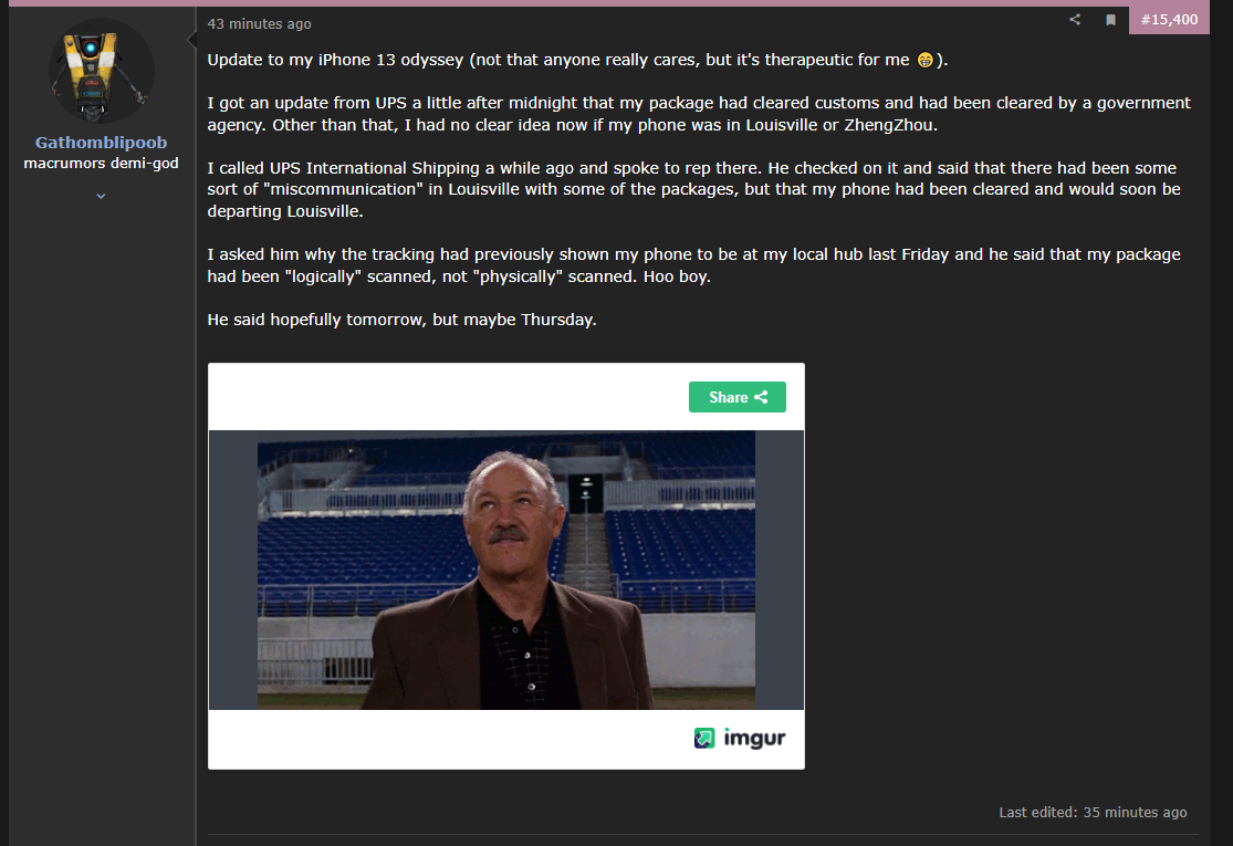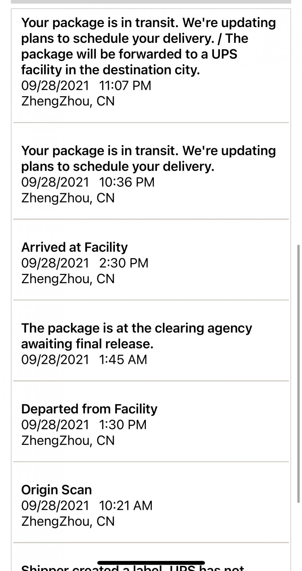 All UPS packages from Apple previous to my long awaited ( :😁: ) 13PM, including my wife's launch day 13PM, have had departure and arrival info out of and into every airport along the way, usually posted immediately or within a few hours of any change.He confirmed that the package has left China and is currently in "transit" and updates are expected today.