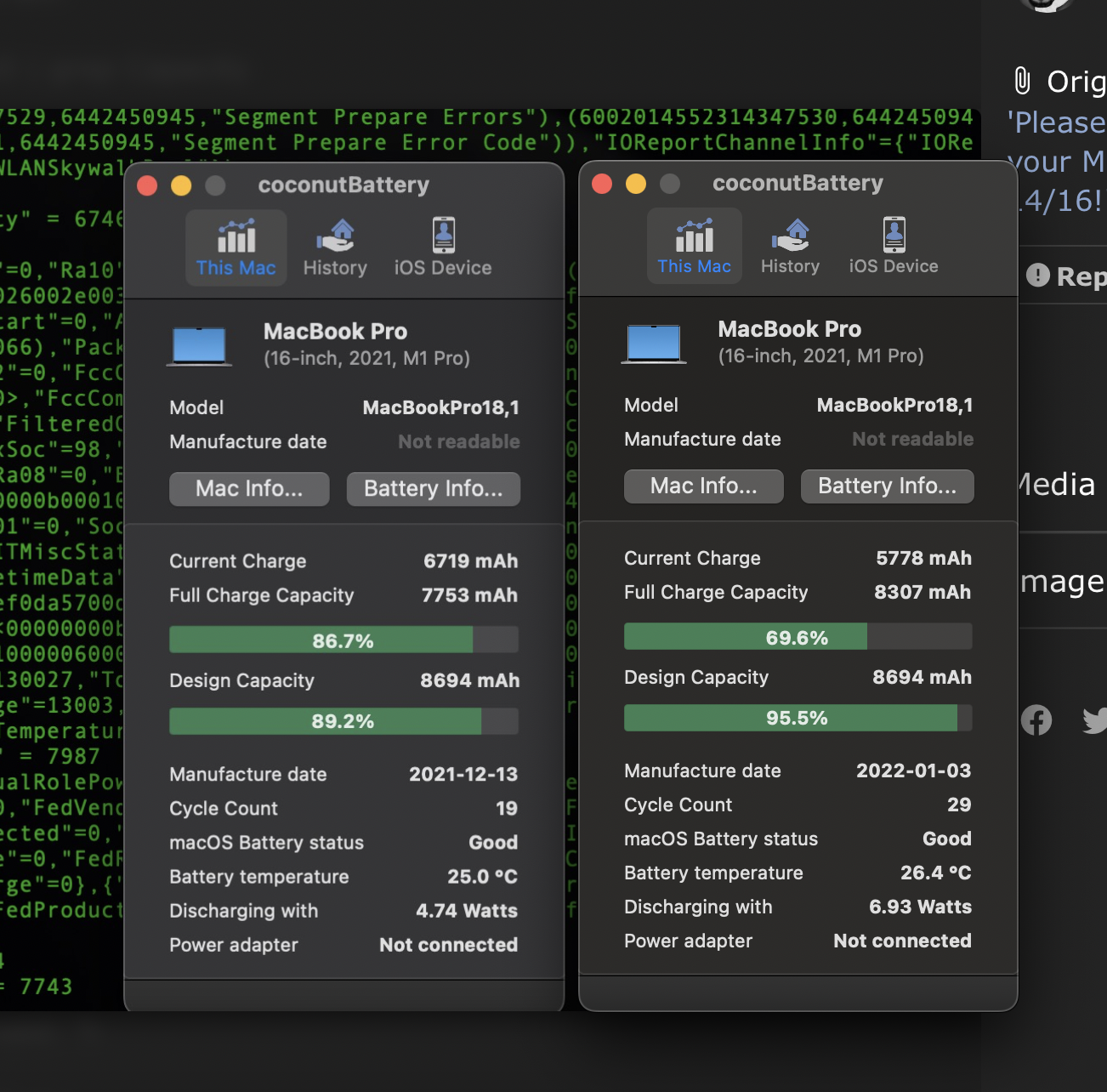 I have a 16" M1 Pro non-max, bought it in February this year, only done 150 cycles and the Apple battery health is 90%, coconut 87.2%.