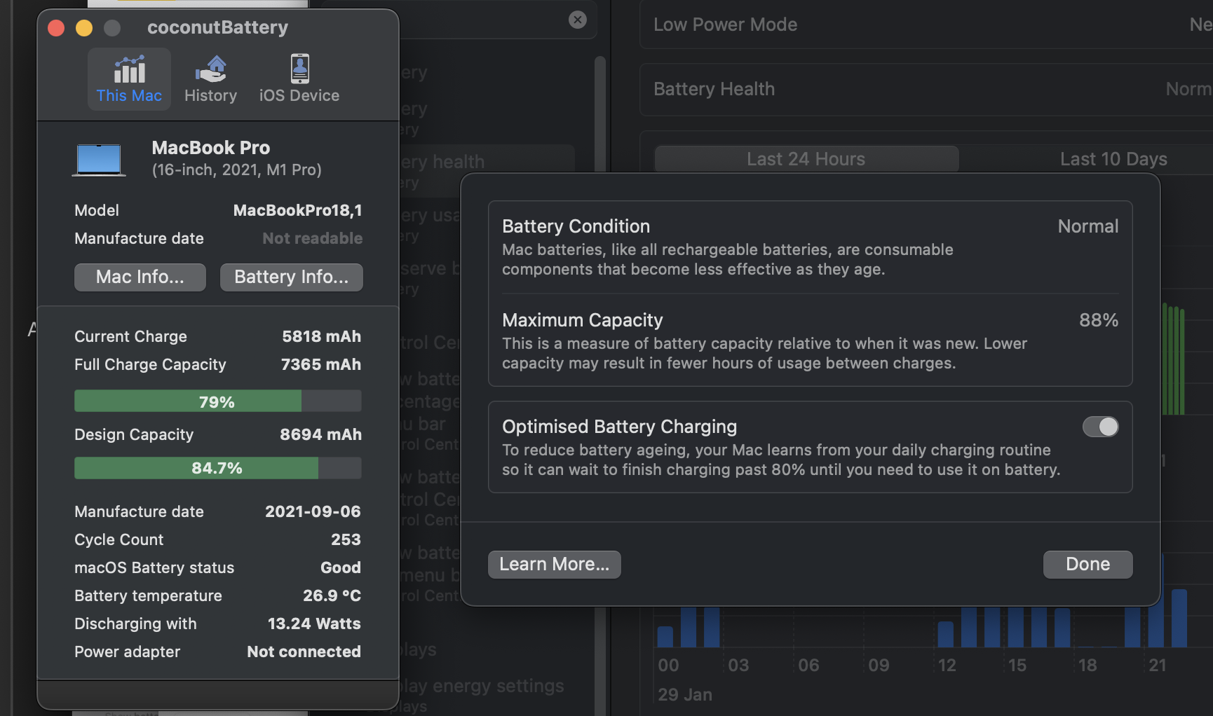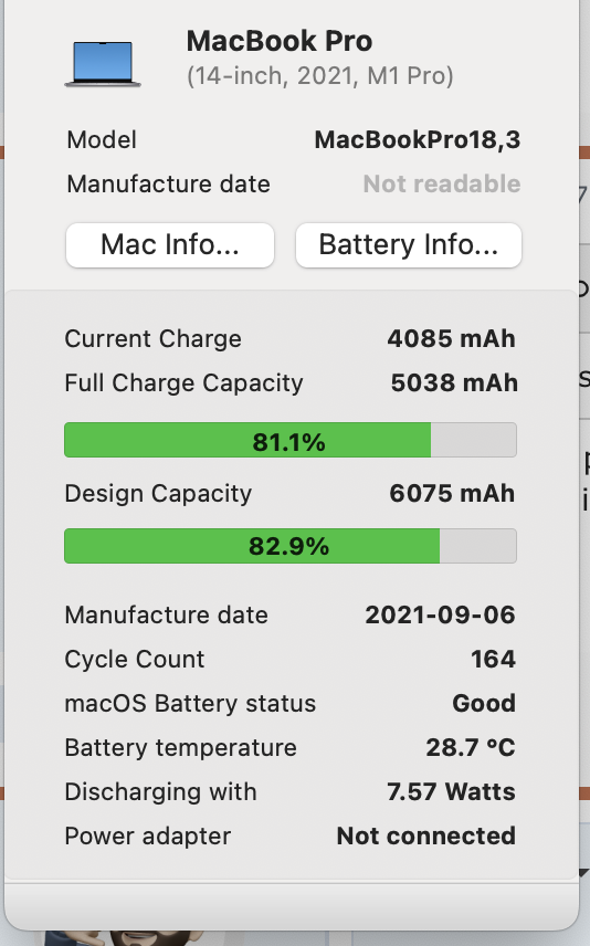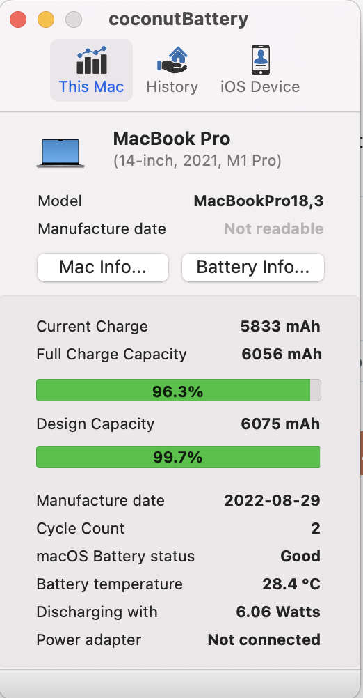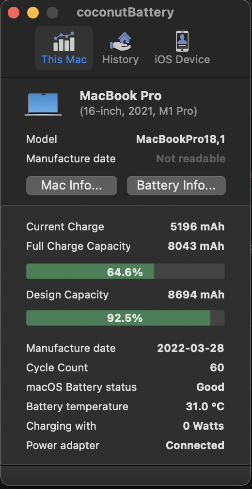 The same. Using my MBP 16 M1 Pro since 6th of august (6 months), now I have 95% in settings, 92% in coconut battery, 61 cycles. I’ve posted my analysis with a long text aboveThanks for the info. The battery thing is probably my only disappointment with the MBP14. Shouldn't degrade this fast IMHO. Mine is down to 94% in about seven months and 60 cycles. Installed AlDente to try to stop the bleeding.