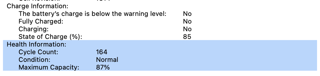 Anyhow, I went to the Apple Store today to do an analysis of my battery degradation and I found out my launch day model is currently at 85% however Coconut Battery reports 82-79% most of the time and Apple own Battery Health app says 87%.
