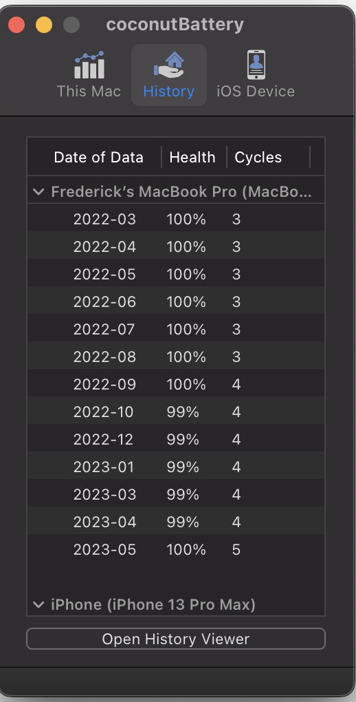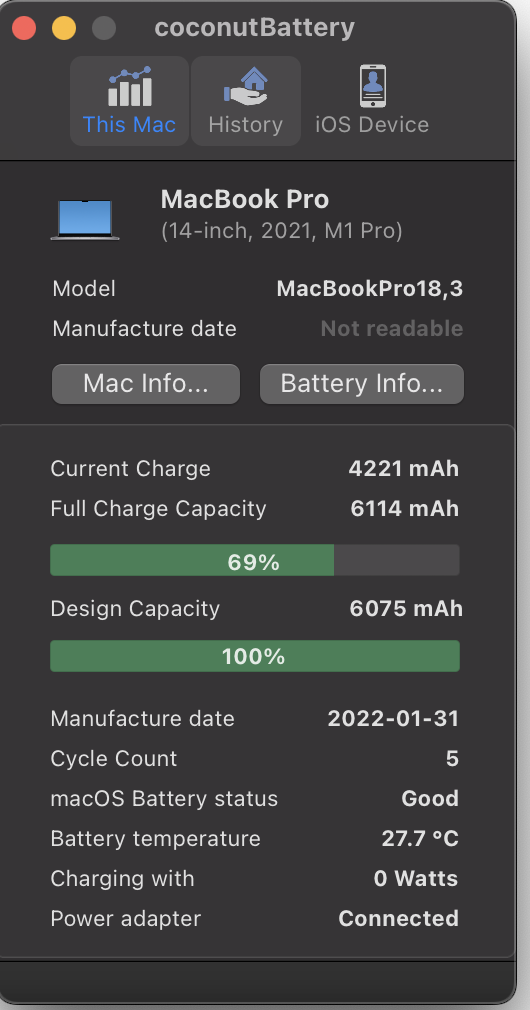 So I've posted in this thread before a few times. I bought my MBP 16in M1 Max in August 2022. Out of the box it was showing 98% design capacity in CoconutBattery. It would sometimes drop down to 94%, but generally hovered around 97-98%.