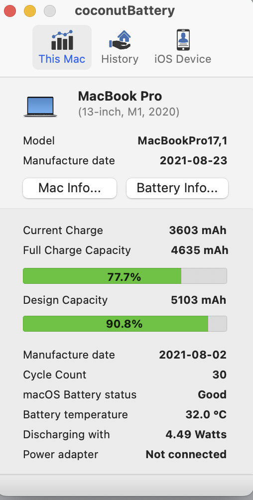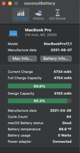 I've seen quite a few numbers along these past days, but this is a good average giving roughly a 99.6% health right now. Apple still states 100% so everything in order, so far so good.Code:... "CurrentCapacity" = 100 "AppleRawCurrentCapacity" = 6050 "DesignCapacity" = 6075 "CycleCount" = 12 "AppleRawMaxCapacity" = 6050 ...