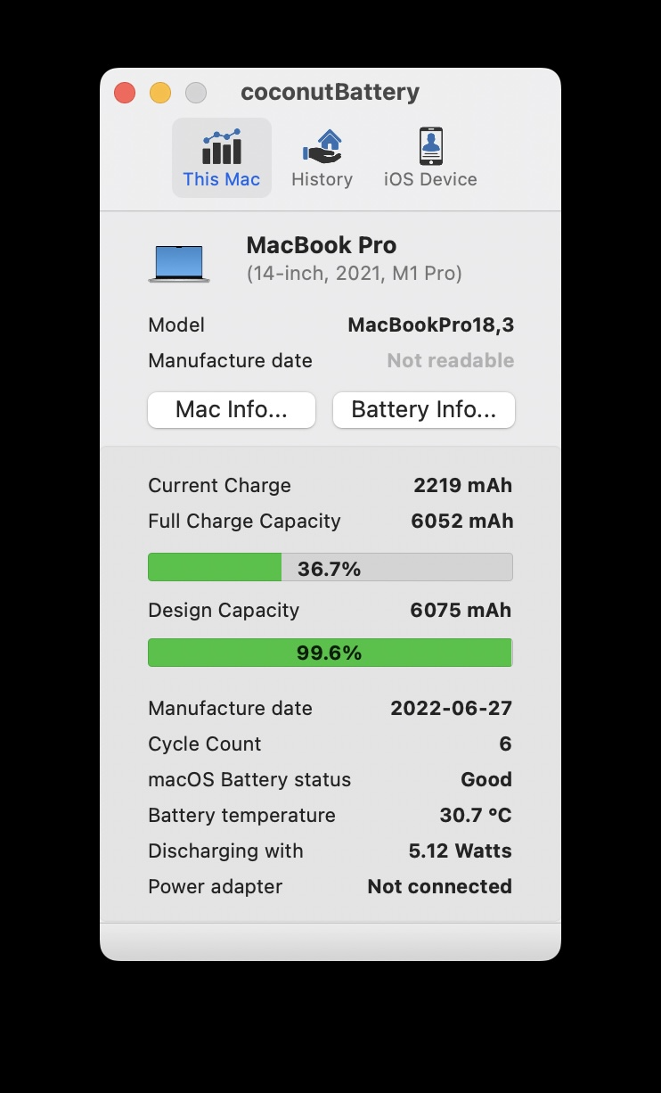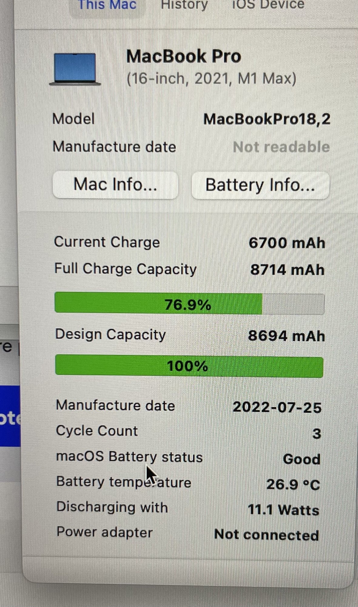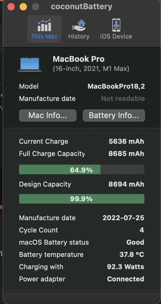 To reply to my own post, my MBP is now showing as 100% of design capacity within Coconut Battery now that I'm at 9 charge cycles. So, it does appear there might be an odd period of battery calibration and normalising out of the box that we never saw with Intel MacBook Pro models. It's curious. I'll continue to keep an eye on it.Got a 16in MBP M1 Max a few days ago. Now on the 4th charge cycle and showing at 98.4% of design capacity in Coconut Battery. It was at 97%.