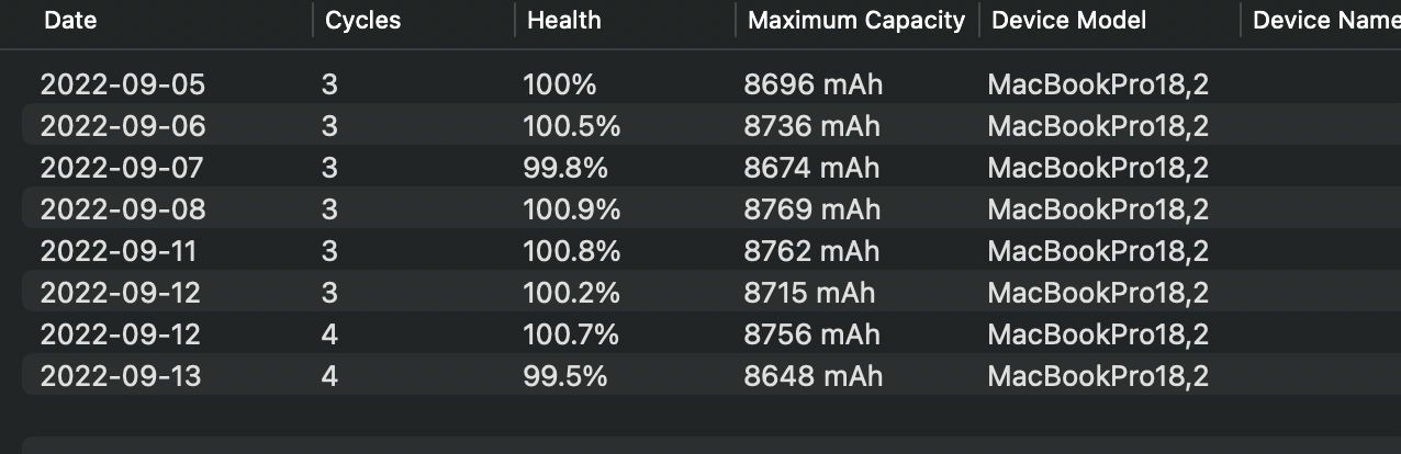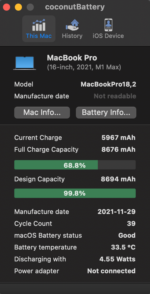 Is that in Coconut Battery?Got mine on launch day. Still 100% health. MBP 16 M1 MAX