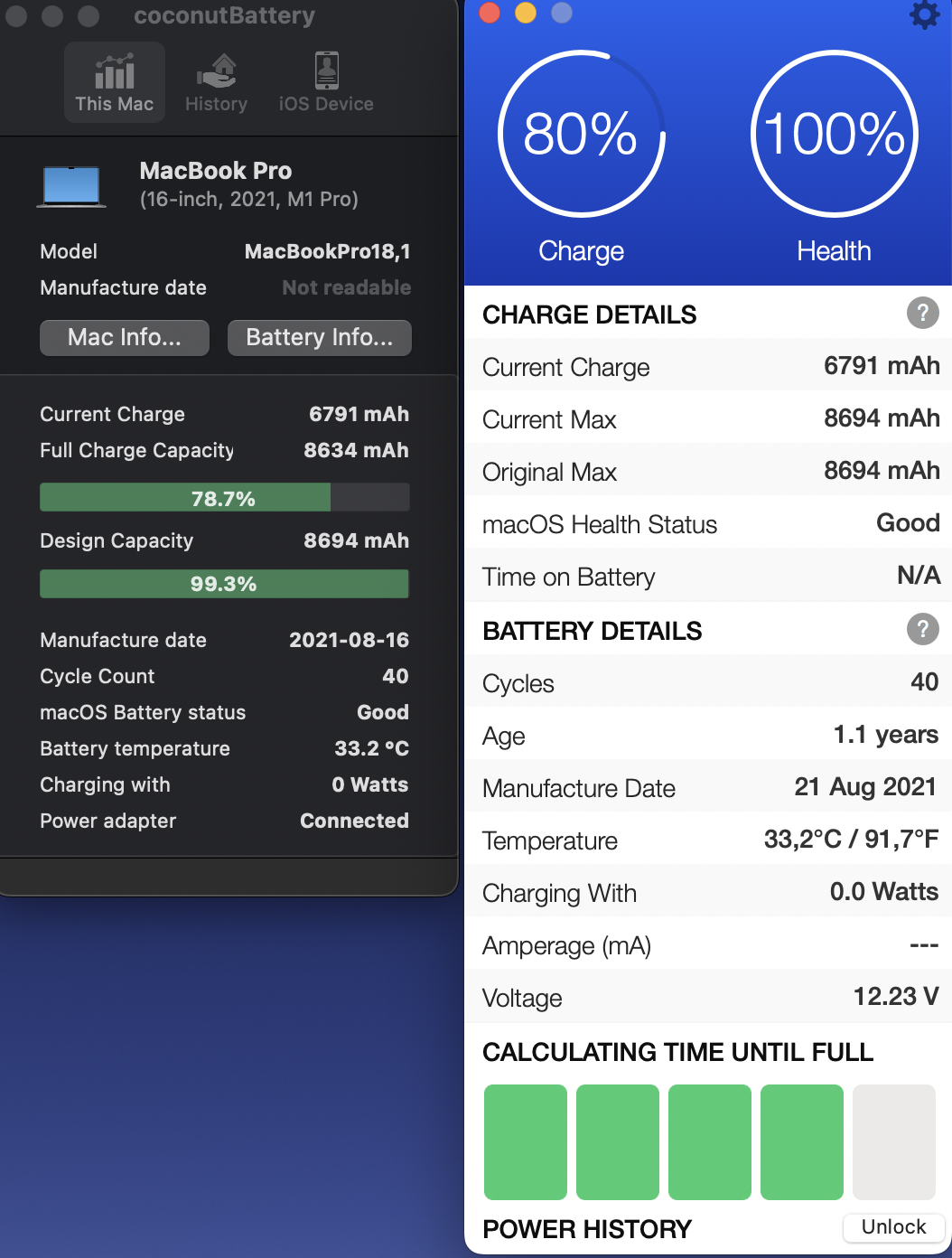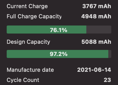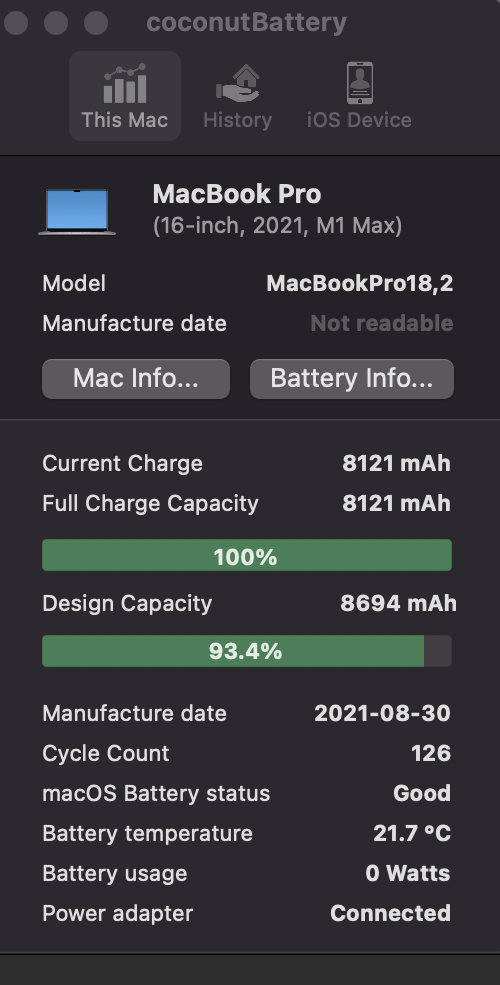 When you say 98%, is that what System Preferences > Battery > Battery Health reports? Because obviously Coconut Battery is reporting something 93.4% there. As mentioned, Coconut Battery reads straight from the hardware.I use my 16in M1 Max during the day solely on the battery and plug in at night with the 140w supplied charger. I received mine at the end of Oct 2021 (one of the first ones delivered) so it's been almost one year of ownership. Mac battery health is at 98%.