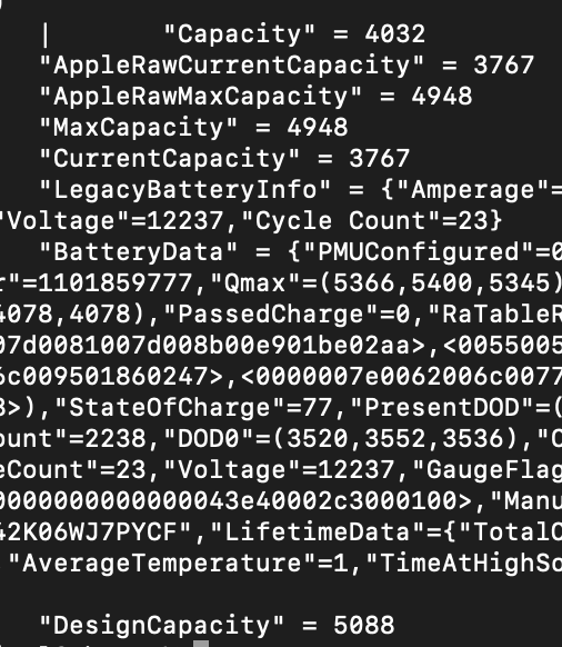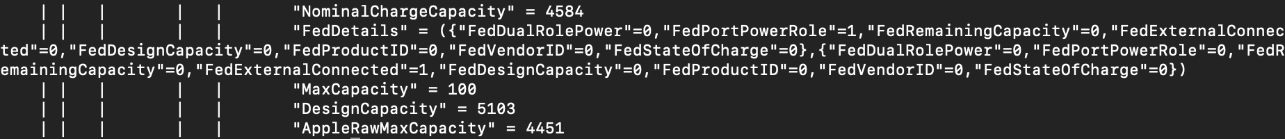 ioreg -l -w0 | grep Capacity