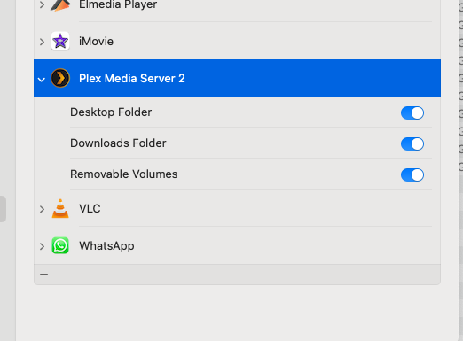 Within Plex the libraries that point to the External Hard Drive are black... just a black area showing no sub folders or directories. If I go to main screen and try to open a video (that previously worked a few days ago), it gives me a permission error. So I go to Privacy -> Files and Folders -> Plex -> Give Access to Desktop, Downloads, and Removable Volumes. Still nothing.