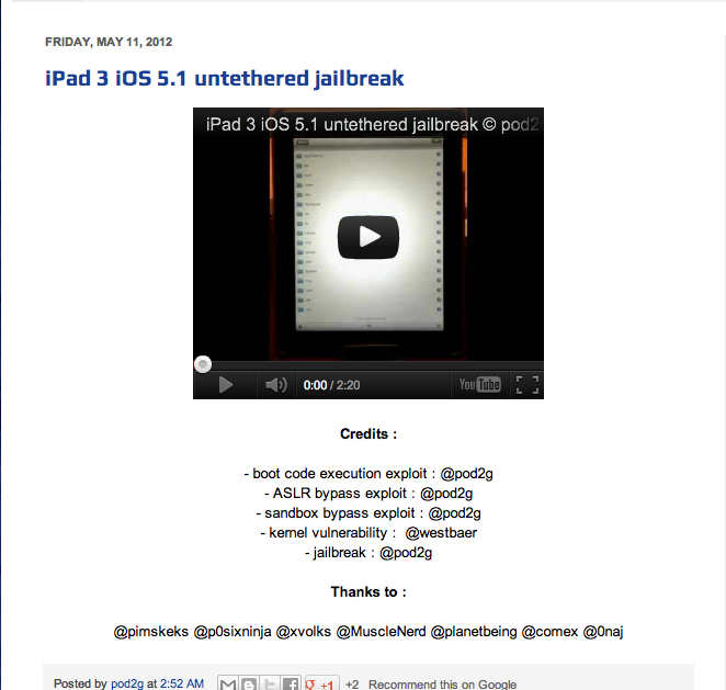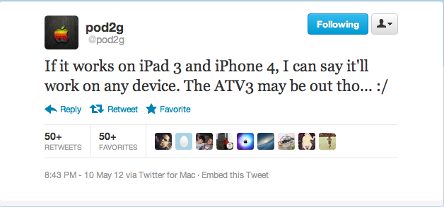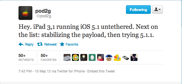 Update from pod2g "Hey. iPad 3,1 running iOS 5.1 untethered. Next on the list: stabilizing the payload, then trying 5.1.1."