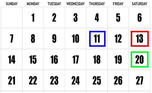 You are having a conversation, which is taking place on Thursday the 11th (blue). Your friend says he is free "next weekend". Which weekend does that mean?
