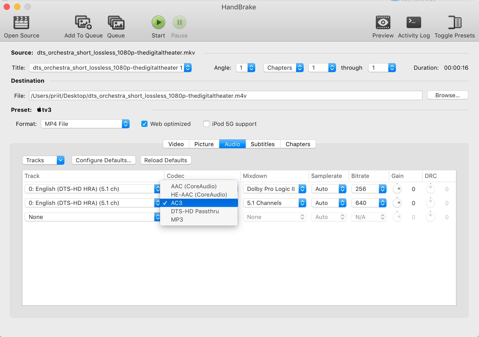 No dice on HB for Mac. It doesn't even recognise, the source has 7.1 channel setupYou are correct about DTS audio (which is why I don't use ATV). Not sure about Dolby TrueHD. Regardless, both HD audio formats are in 7.1 (typically) so you'd just have to choose the 7.1 encode option in the audio tab of Handbrake. AC-3 or eAC-3 shouldn't matter since both are supported on the ATV 4.