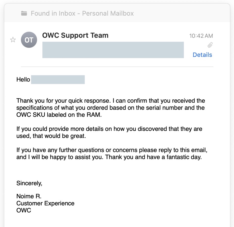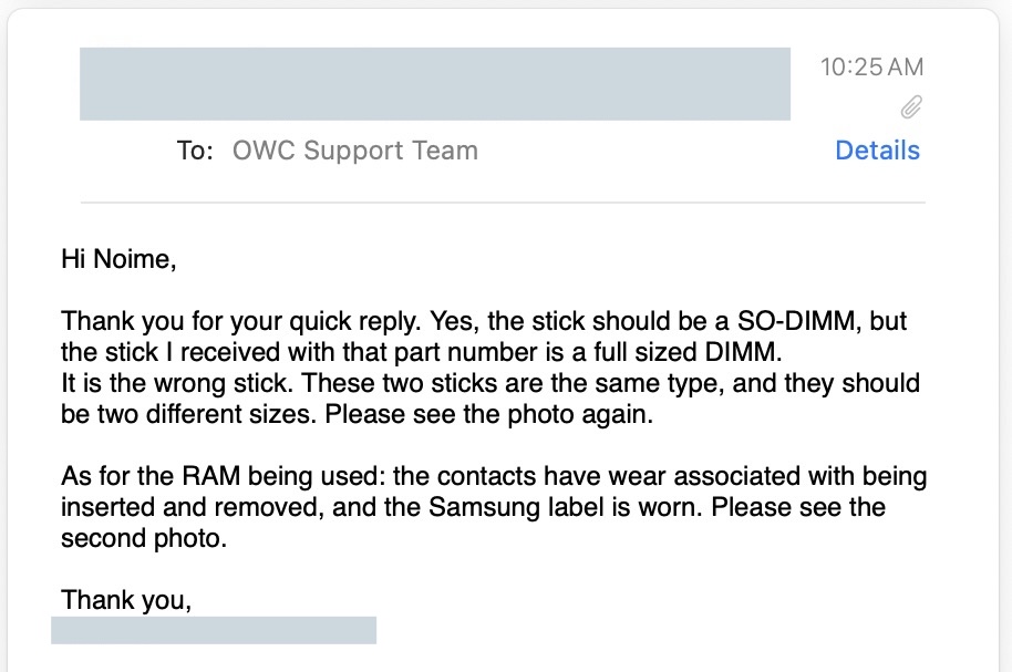 Despite providing multiple photos, OWC support repeatedly insists they sent the right item and does not address the fact they are used. It seems they are not thoroughly reading my emails or sufficiently knowledgeable about memory.
