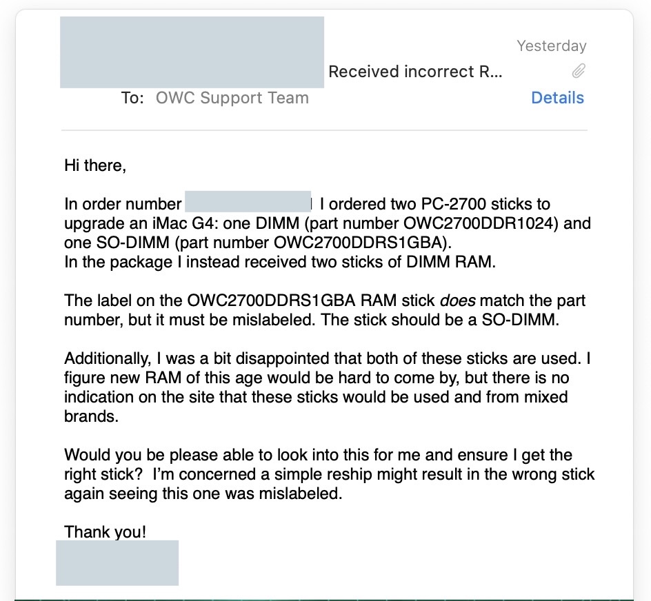 I ordered two sticks of memory from OWC to max out an old Mac: one full sized DIMM and one small SODIMM.
