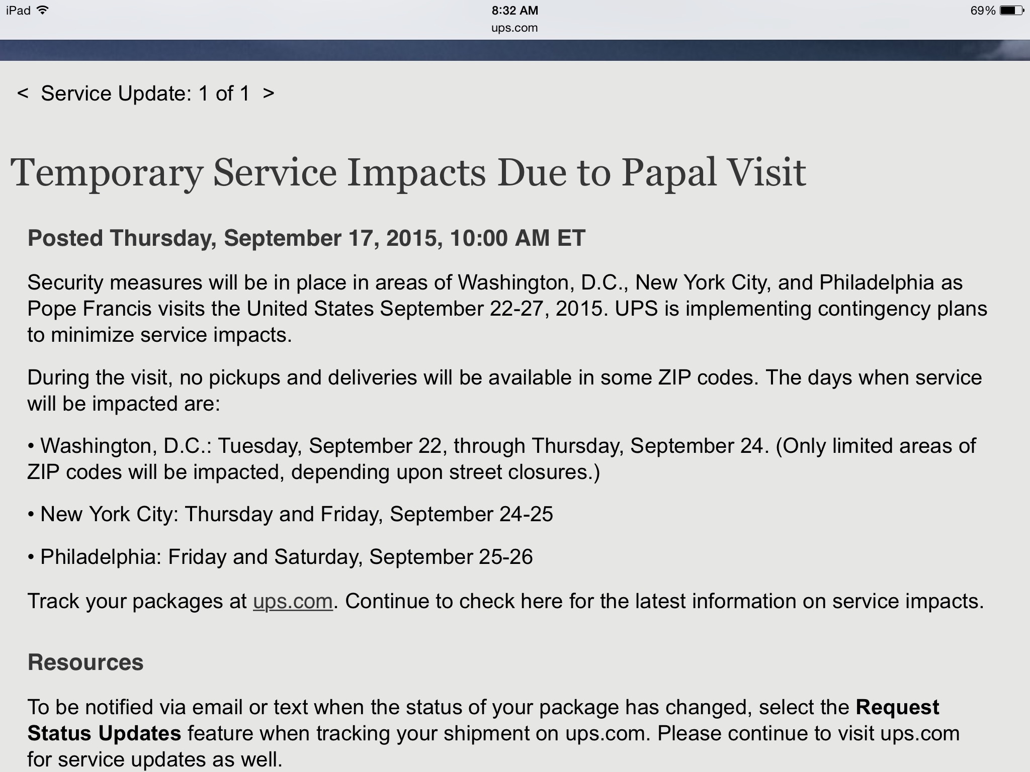 UPS has posted no deliveries or pickups on 9/25 and 9/26 on some zip codes in NYC & Philly. Wonder how many people will not get their new iPhones on release day....will Fed Ex do the same?