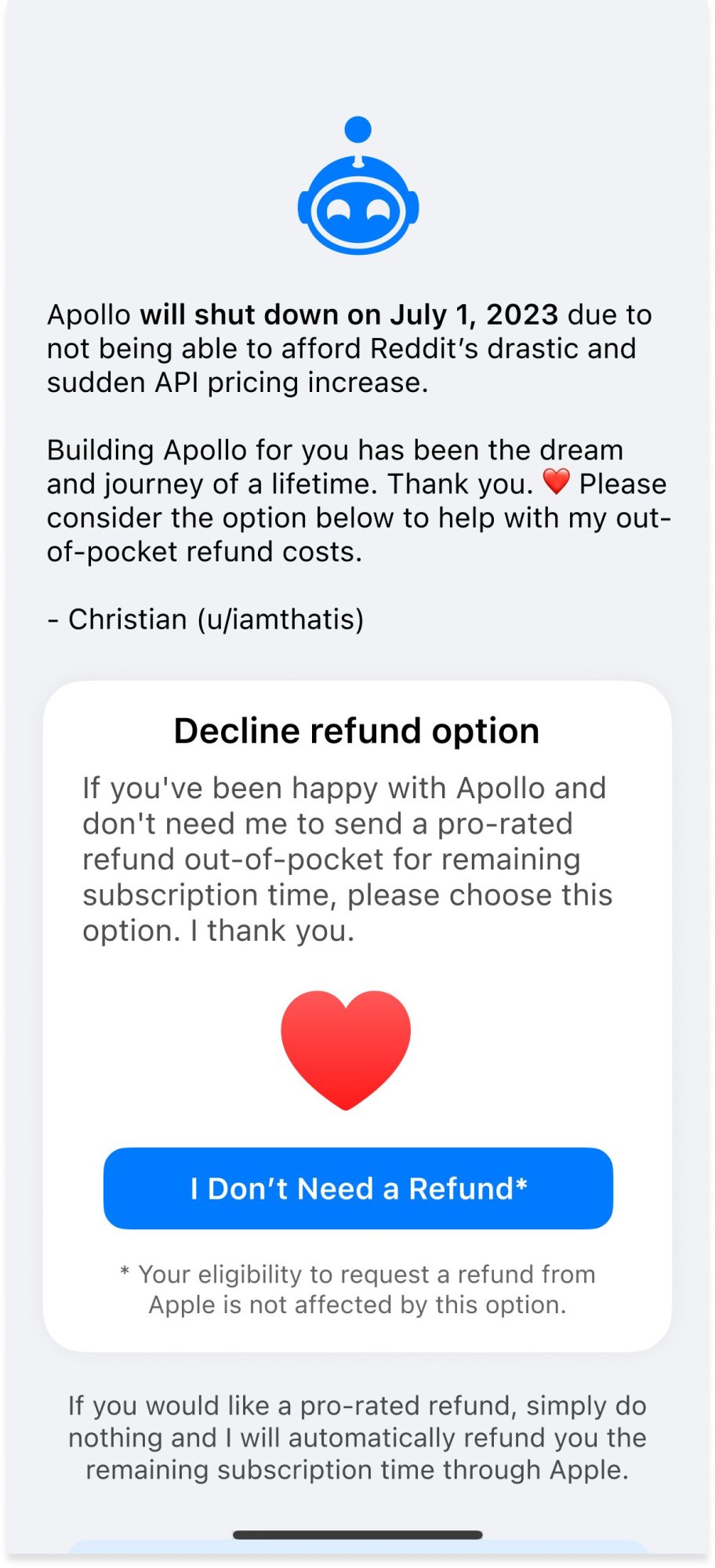 The issue is that he’s looking at baseline costs of $2.50 per month per user, just for the Reddit API. This doesn’t factor in other API call costs, server costs, etc. Add on other stuff, plus the 30% cut to Apple, and you’d need to charge somewhere in the range of $50-60 per year.