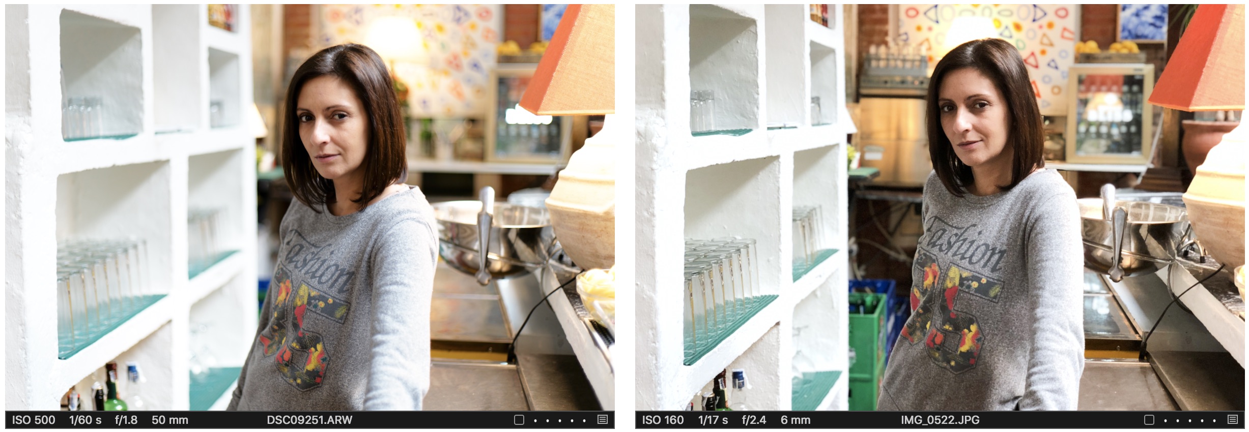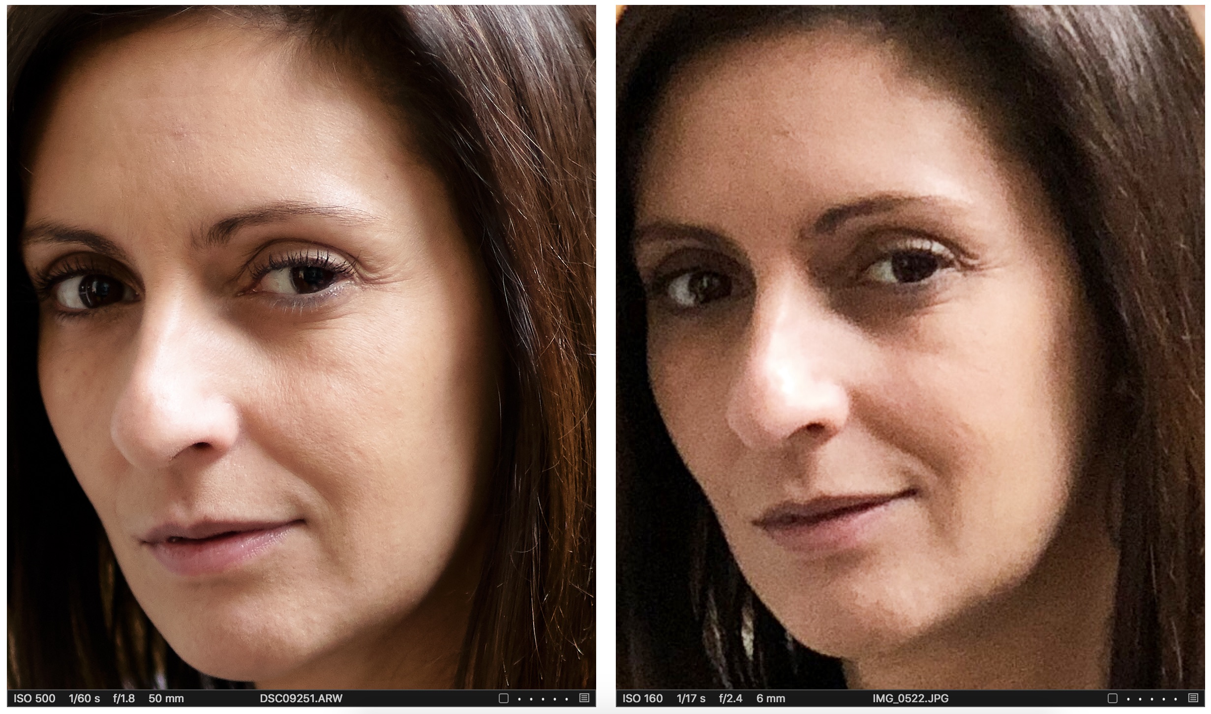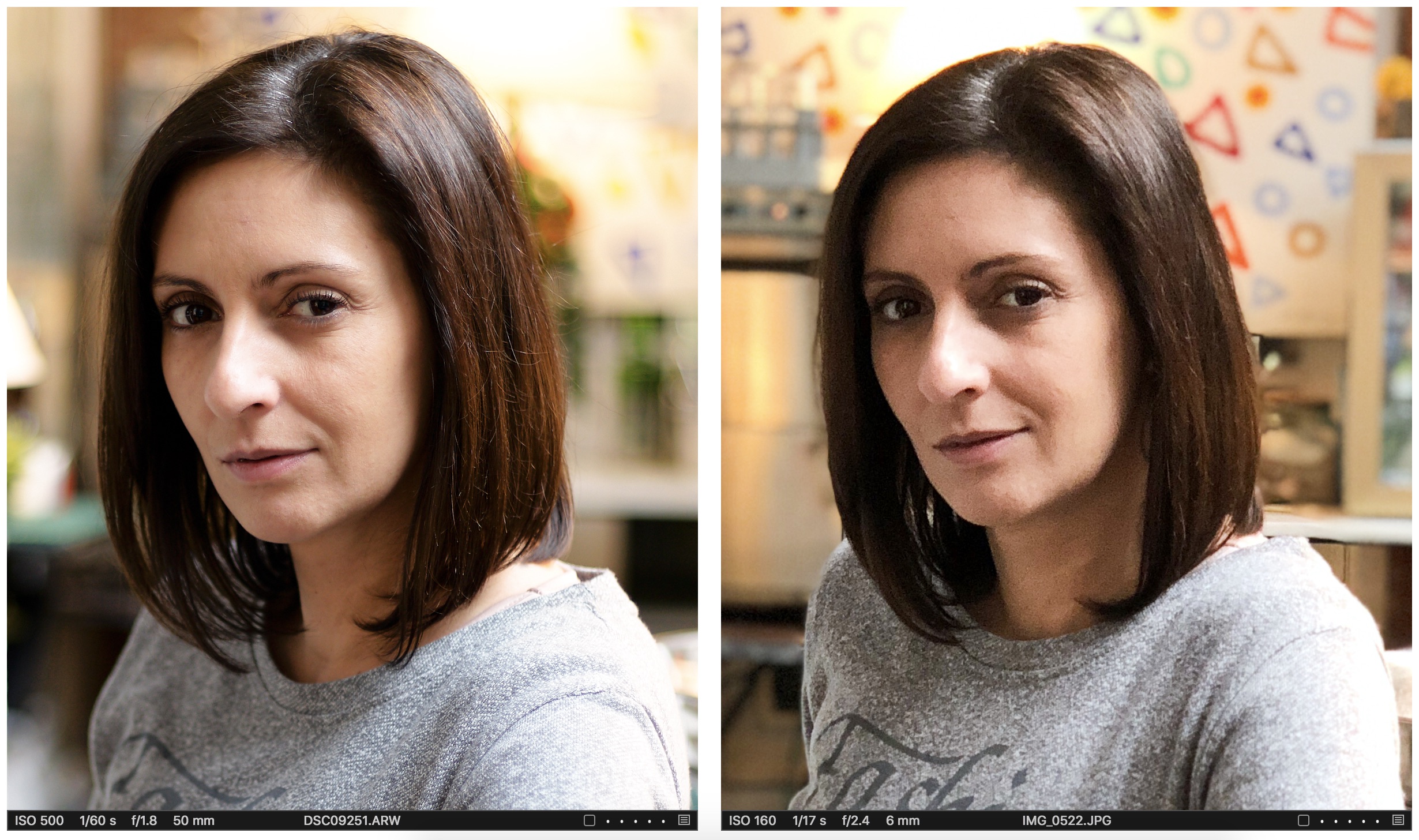 I'm just viewing the pics in the computer now, and the differences are much more evident (of course). I need to say, the light there is far from being perfect, and also I needed to rise the exposure a bit in Capture One as the iPhone pic was a bit dark (that's why more noise is visible). I tried to match a bit the white balance, and cropped the iPhone pic to 3:2 just like the camera. If I edit the pic in focos app, I could get a more blurred background, but the point is showing the default amount of blur from the iPhone camera app.