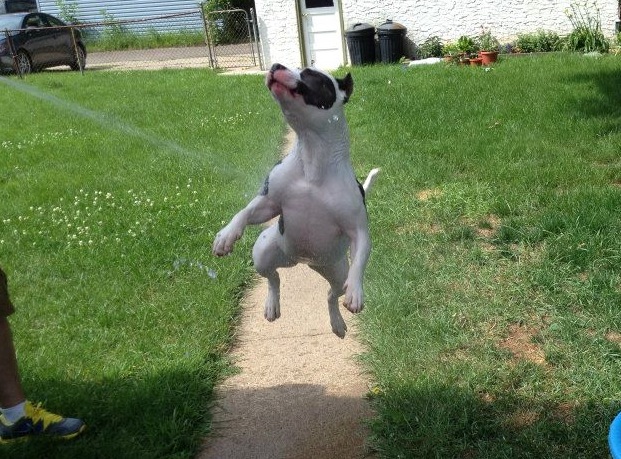 The cute pit above makes me wanna post Lucy. This is our little rescue lady we adopted almost a year ago now! She was tiny...now she is a monster. The airborne picture below is Lucy trying to bite the water as it comes out of the hose, one of her favorite activities. Even though she is getting big, the cats still put her in her place and rule the house.