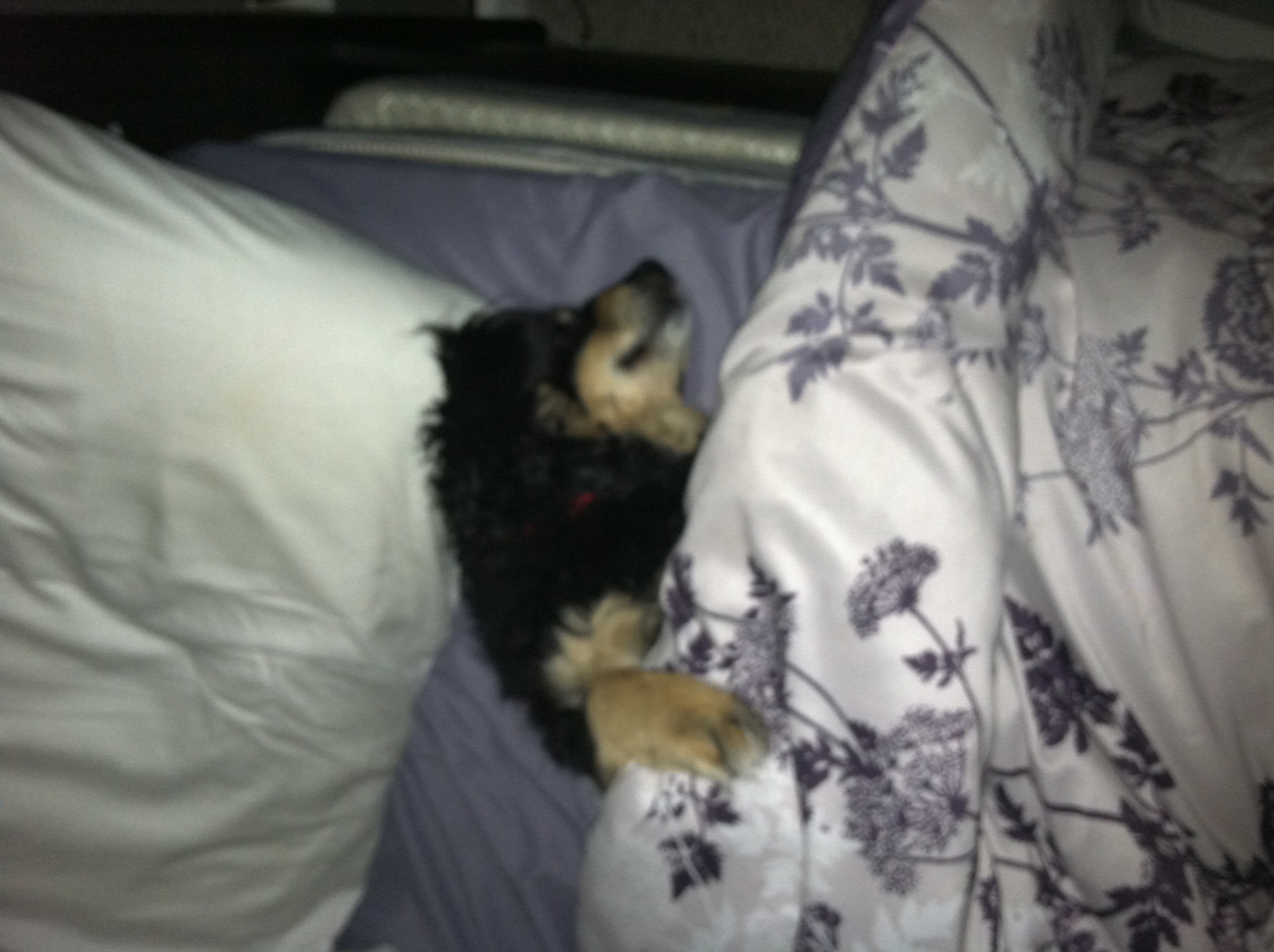 Sleepy guy takes my spot when I get up in the morning and my fluffy mini Aussie.