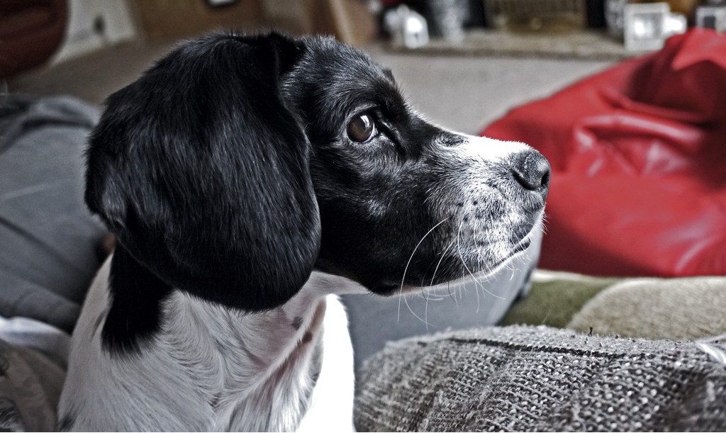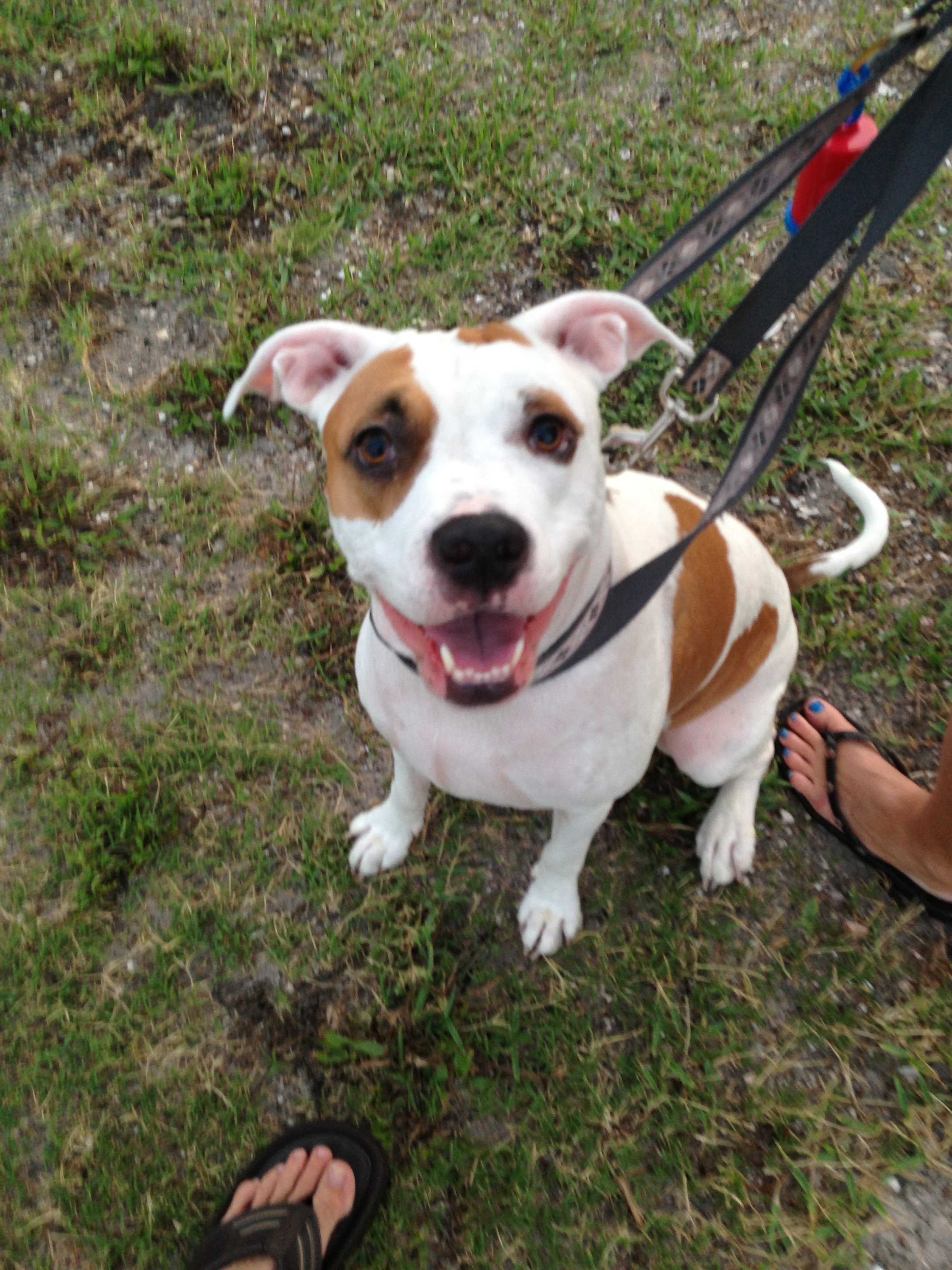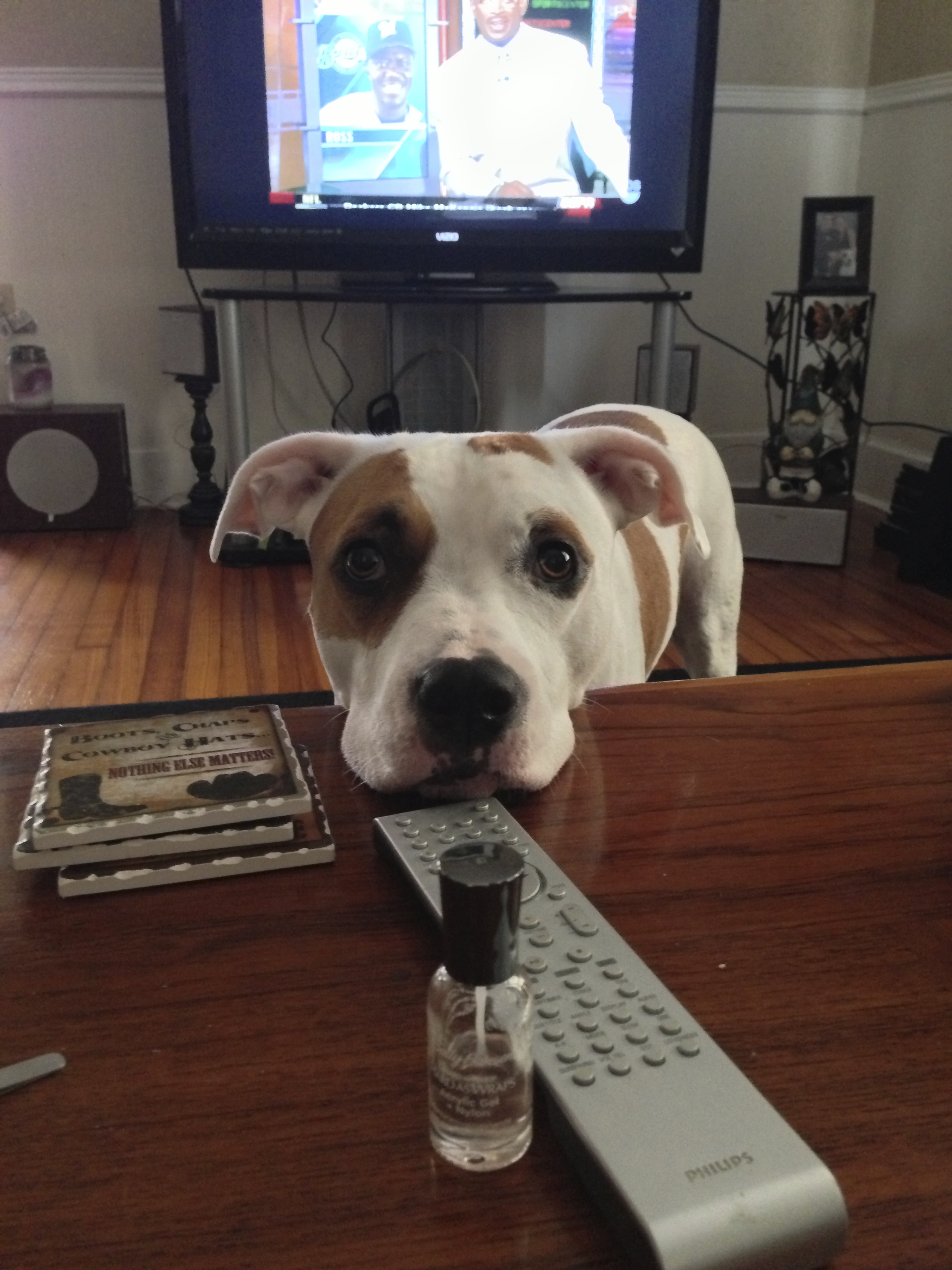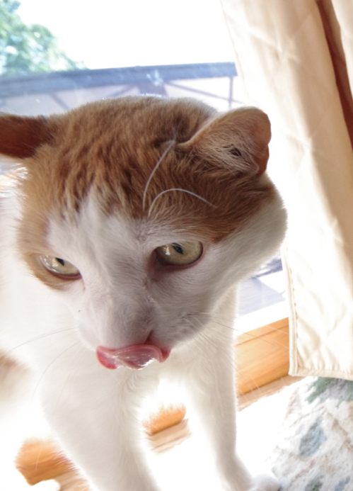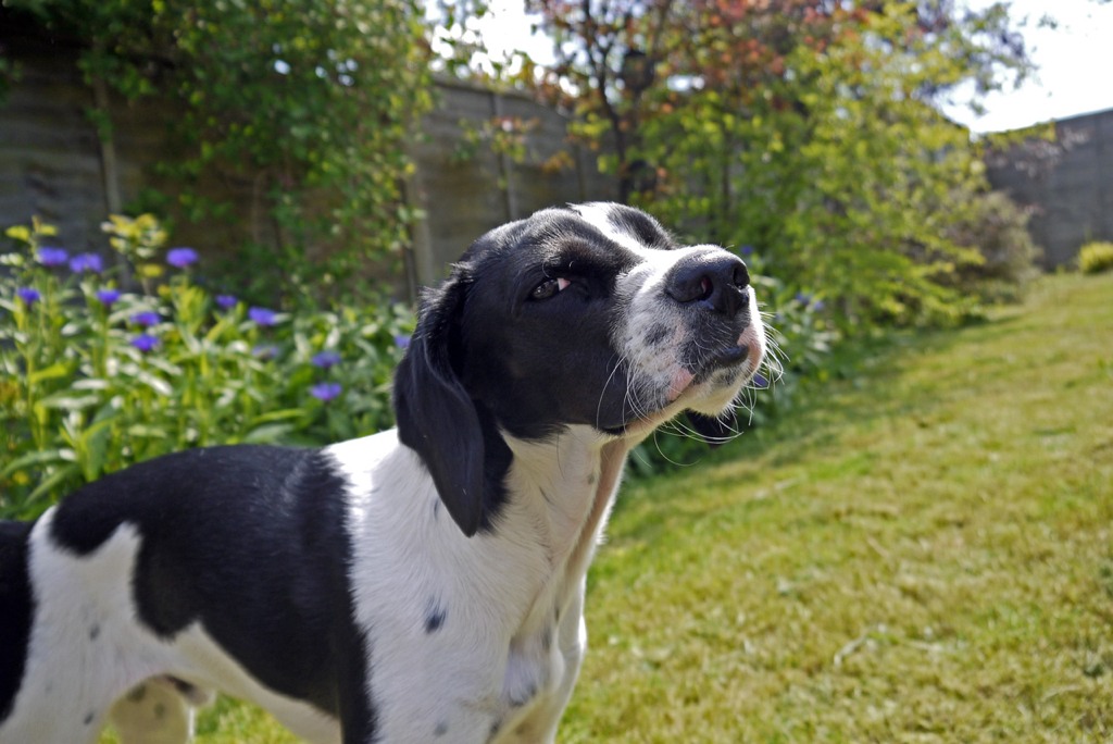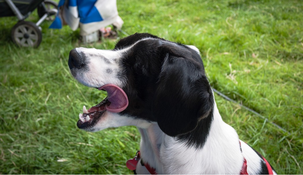 Licking his lips as he'd just jumped shoulder height to steal a bite of my wife's hog roast sandwich.