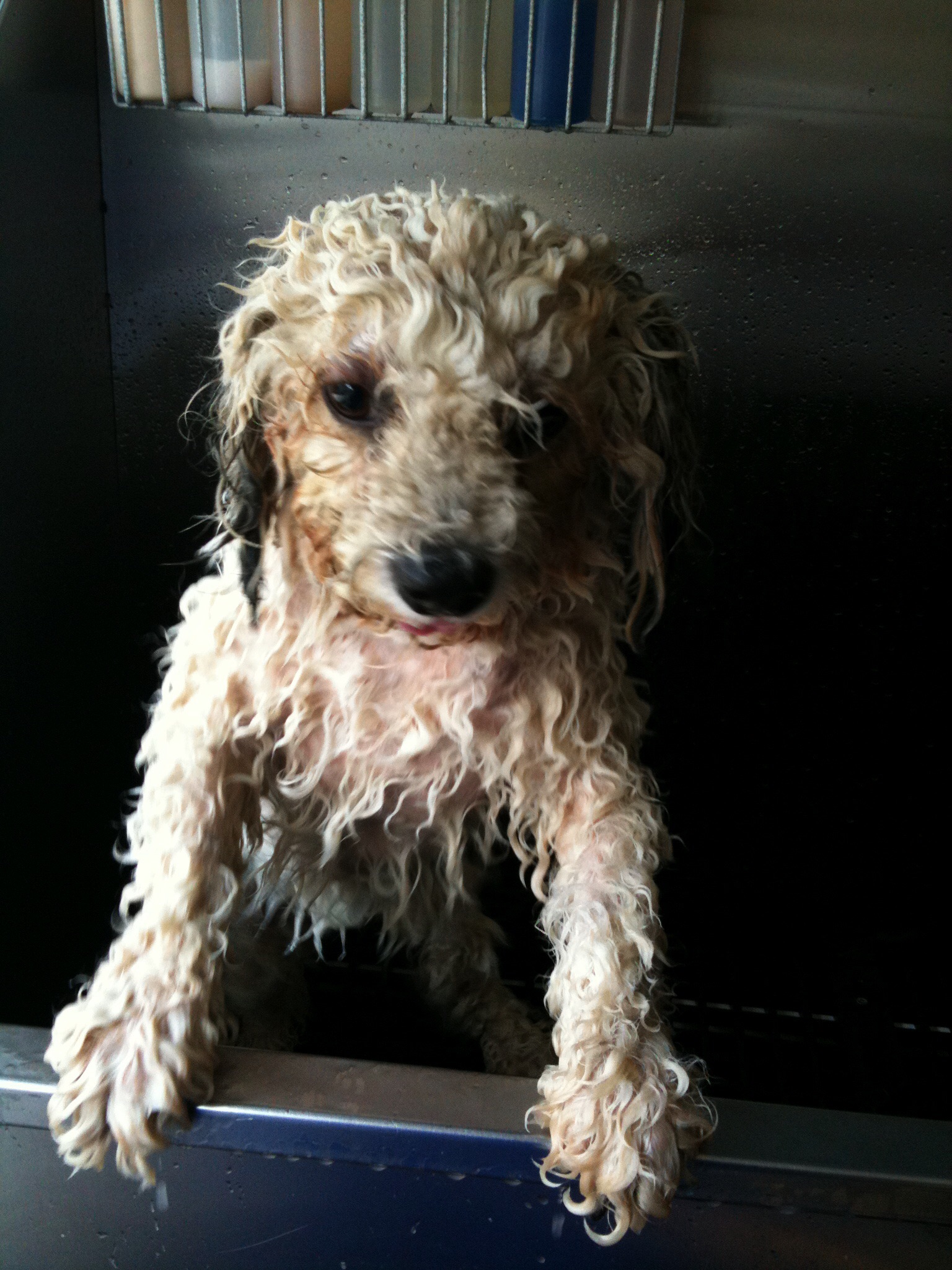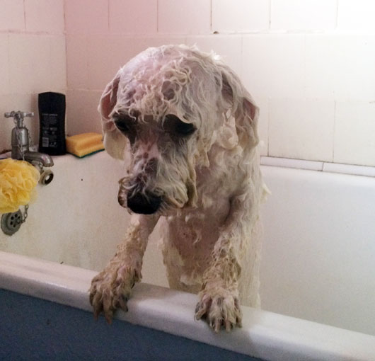 Holy smokes! Nukes and Buddy are bath twins. He HATES baths (too bad, so sad for a Bichon), so I get him groomed, but this is the one time we tortured each other at a do-it-yourself-groom place.