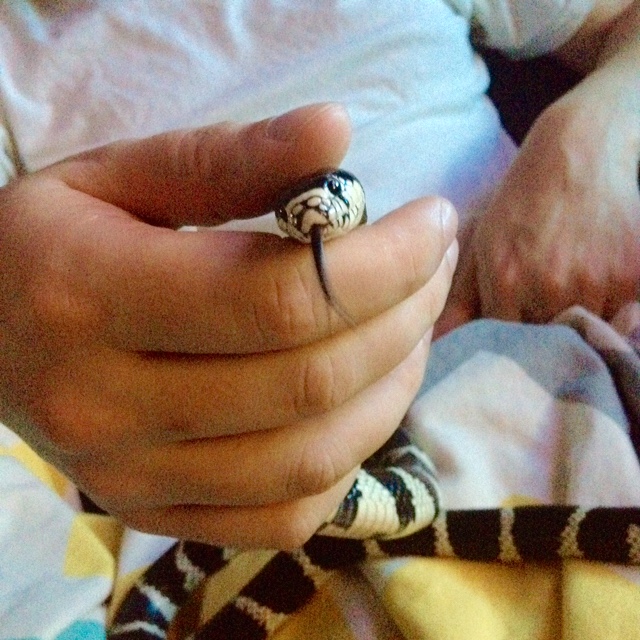 One of my two newest. Her name is Rogue. A sub-adult California King. She's the sweetest snake ever. She's literally like a puppy dog. She lays across my lap and falls asleep, lets me hold her and pet her head. Super, super calm and happy. She's so easy to deal with. Never the slightest aggressiveness. Kings are notorious for biting because they're always hungry (not a bad bite at all, but they do bite a lot) but she's never even remotely attempted to bite.