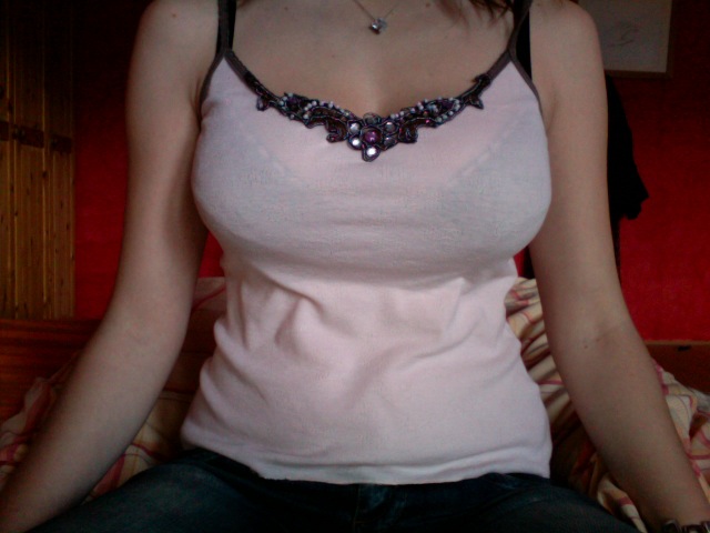 I've never seen a shirt "cleave" like that. My imagination must be very good. I can see past the pink layer, black layer, and all the way to her nice wall and wood "thing" on the very left.