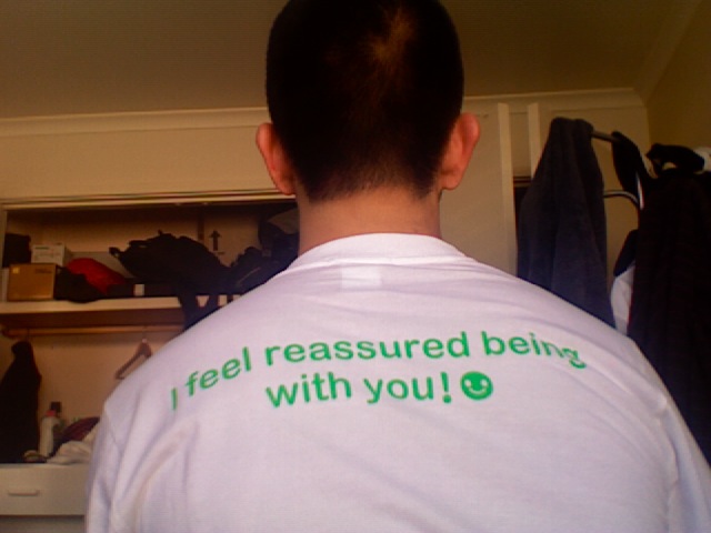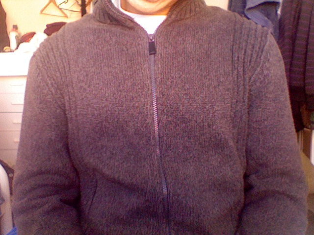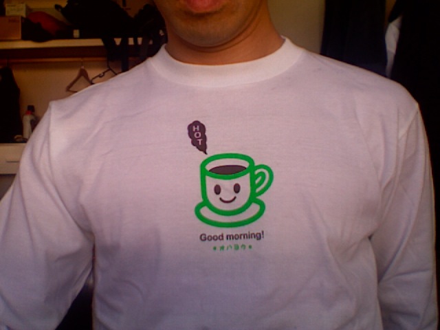 Here's one that my girlfriend bought me. It's from Japan, so of course it's cute. She bought it packaged up in plastic, and she never saw the writing on the back of the shirt She saw the front logo and thought it was cute, but we both agree that the writing on the back of this shirt makes it a bit too weird for a man to wear out on its own, which is why I'm going to wear it under this knitted zip-up. ;)