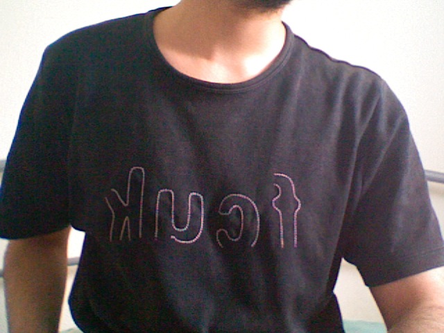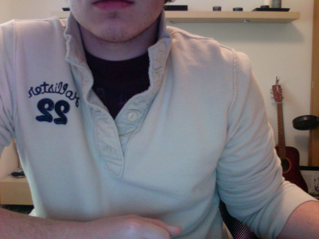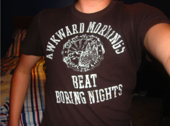 A&F shirt.. it says "awkward morning beat boring nights" i didnt choose it but i usually wear A&F or hollister.. but then again i like volcom and hurley and that stuff too.. So i just wear whatever looks good in the morning:eek: