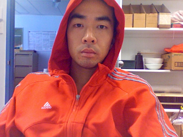Here's my Adidas "hoodie". It's great because unlike similar Adidas jumpers, which only have stiff pop-up collars (but no hood), this one has a fantastic hood. It's made from their synthetic ClimaCool material, which is micro-fleecy inside, and synthetic outside. Wonderful. :) I love the grey stripes on the red colour of this jumper, too.