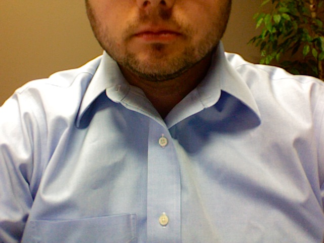 Well since my mere little PowerBook does not have an iSight I will just say that I am wearing a white Abercombie & Fitch short sleeve polo with a white Ralph Lauren undershirt.