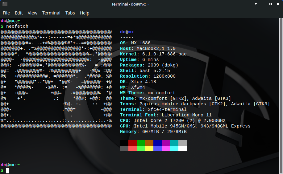 For reasons unknown, MX wouldn't run on this machine when I tried it the other day, hence the install of Antix. However, as these are very closely-related distros, I flashed a new copy of the 32-bit MX installer and tried again, et voila! Not nearly as lightweight as Antix, but still not exactly greedy. Will likely keep this OS on the Macbook.