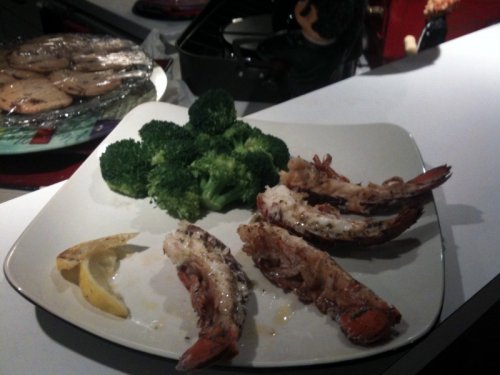 Dinner last Night, Split steamed lobster tails with steamed seasoned broccoli.